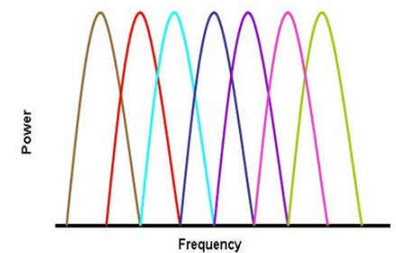 주파수대역을 여러구간으로 나누어 주파수 각 *간섭을 제거해 여러신호를 동시에 보낸다.