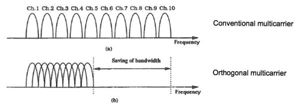 채널간 간섭을 막기위해 각 주파수 대역 사이에 보호대역이 필요해 주파수를 효율적으로 쓰기 힘듦.
