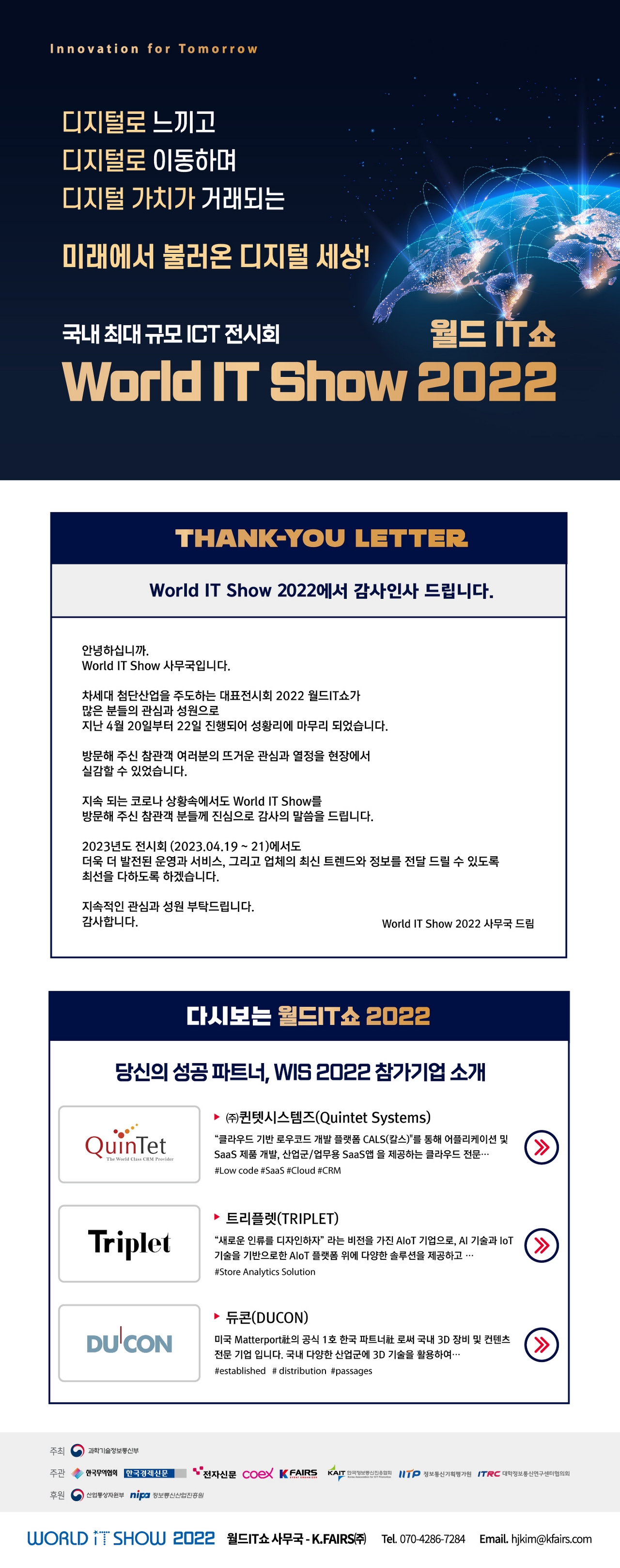 WORLD IT SHOW는 대한민국에서 개최되는 국제 정보기술(IT) 전시회 및 컨퍼런스로, 다양한 IT 기술과 솔루션을 소개하며, IT 산업 분야의 최신 동향과 혁신을 공유하고 교류하는 장을 제공하는 행사입니다. 이 행사는 IT 기업, 전문가, 연구자들이 모여 다양한 분야에서의 기술과 혁신을 선보이고 소통하는 장을 제공합니다.