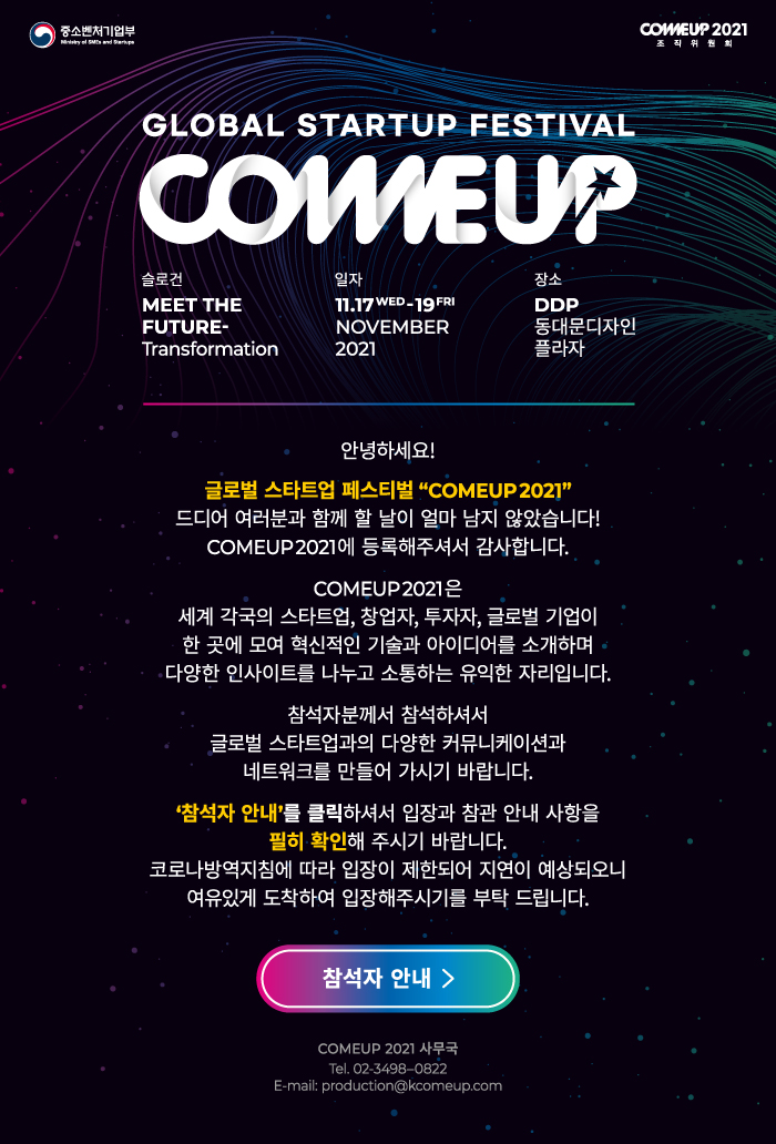 COMEUP은 국내 최고의 권위와 최대 규모를 자랑하는 혁신 벤처와 스타트업을 위한 글로벌 스타트업 행사로 국내 스타트업의 해외 진출, 그리고 해외 스타트업의 국내 진출을 도모함으로써 한국의 창업생태계를 세계에 소개하고 해외 창업생태계와의 교류와 협력을 강화하기 위해 2019년부터 중소벤처기업부가 주최, 민간 스타트업 생태계와 협력해 행사를 진행해 왔으며 2022년부터는 코리아스타트업포럼이 민간 주관기관으로 선정되어 사업을 운영합니다.