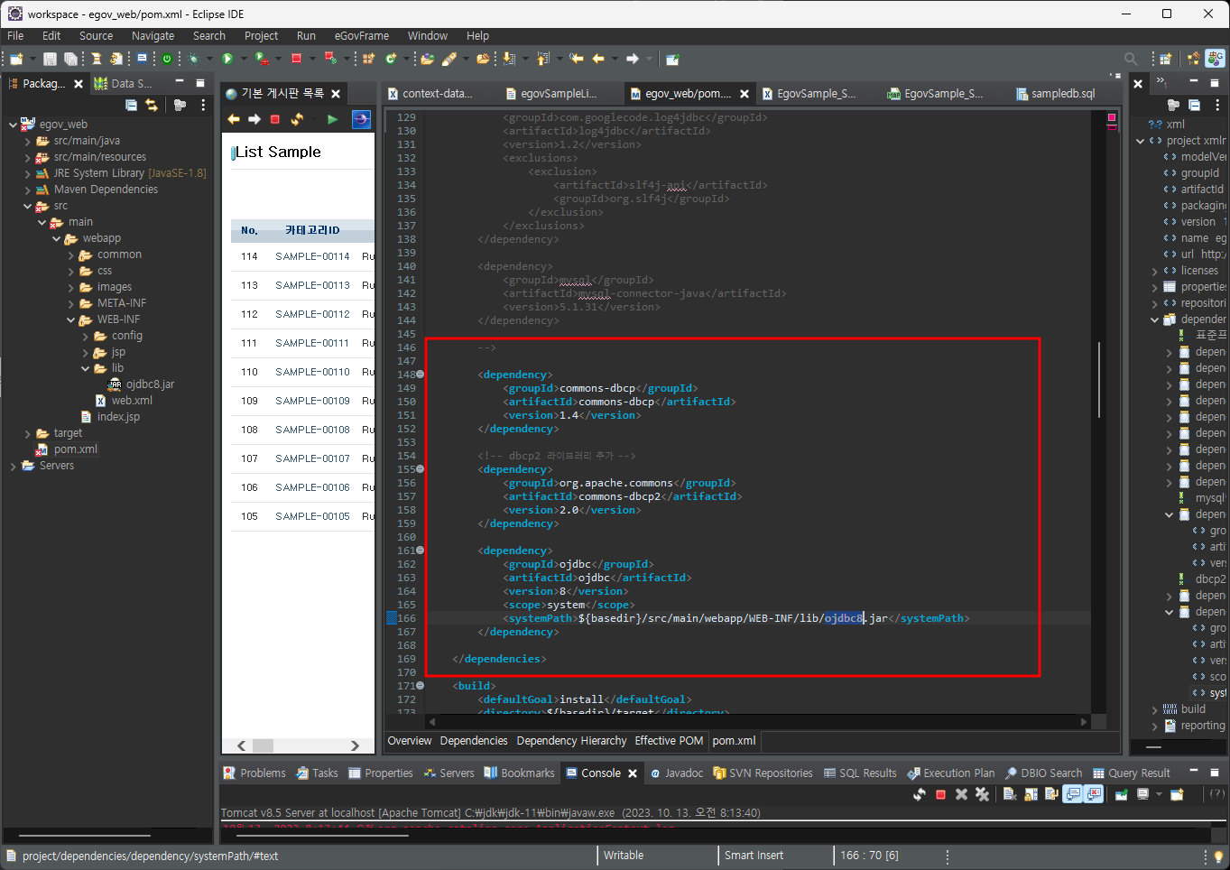 pom.xml - commons-dbcp와 ojdbc 주석해제 + dbcp2 라이브러리 추가