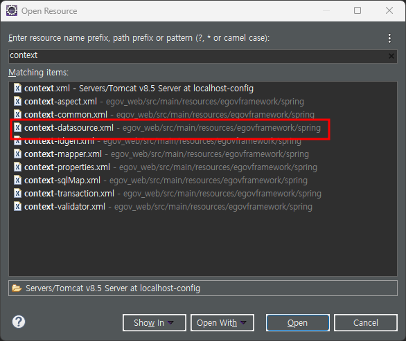 ctrl shift r - context-datasource.xml - open