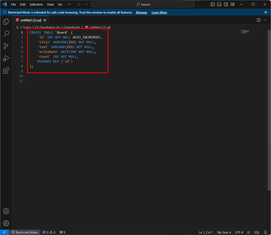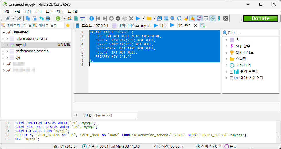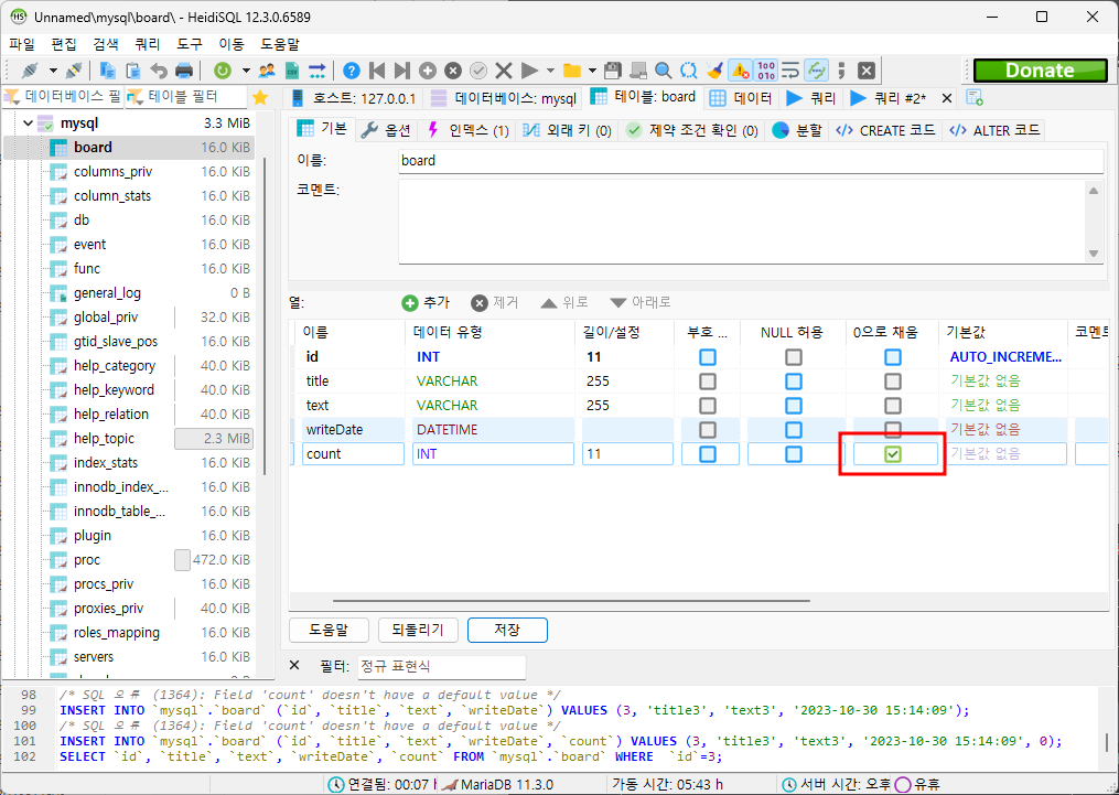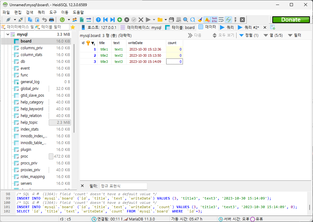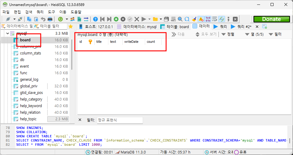 보면 mysql database안에 board라는 table로 생성했다.