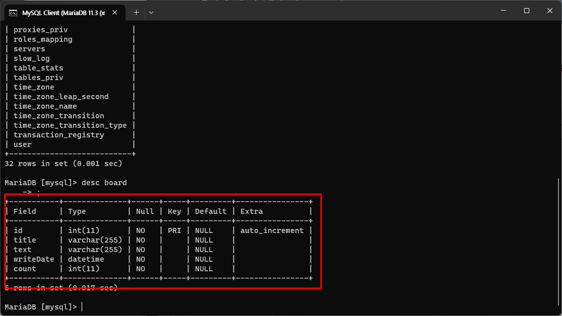 mysql에서 board란 table의 desc 정보를 확인해보자.