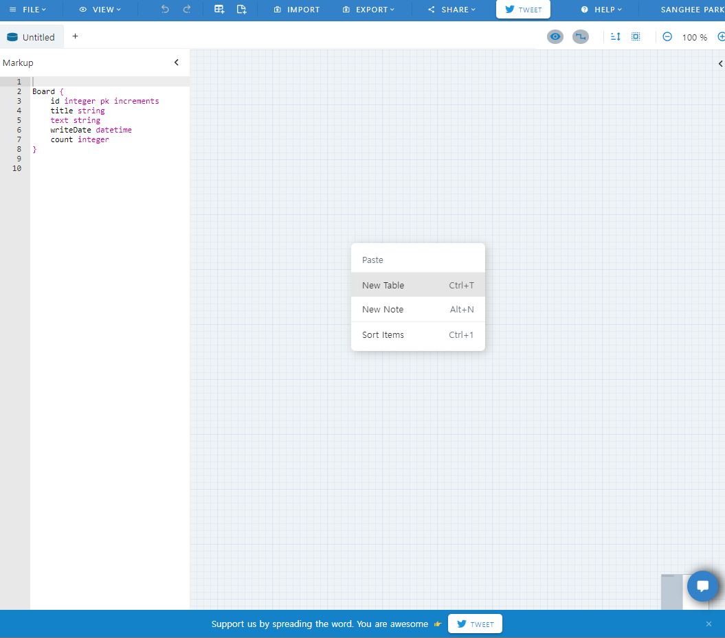 마우스오른쪽 - new table