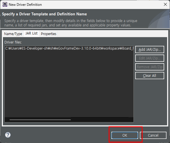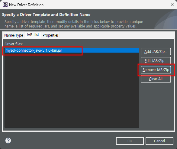 다시 Eclipse로 돌아와 기존에 지정되어있는 jar를 remove하고 다운받았던 connector를 add한다. - ok