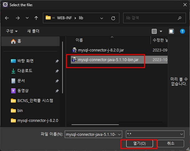 링크접속 - platform independent - 다운 - no thanks - 완료 https://dev.mysql.com/downloads/connector/j/ MySQL :: Download Connector/J MySQL Connector/J is the official JDBC driver for MySQL. MySQL Connector/J 8.0 and higher is compatible with all My