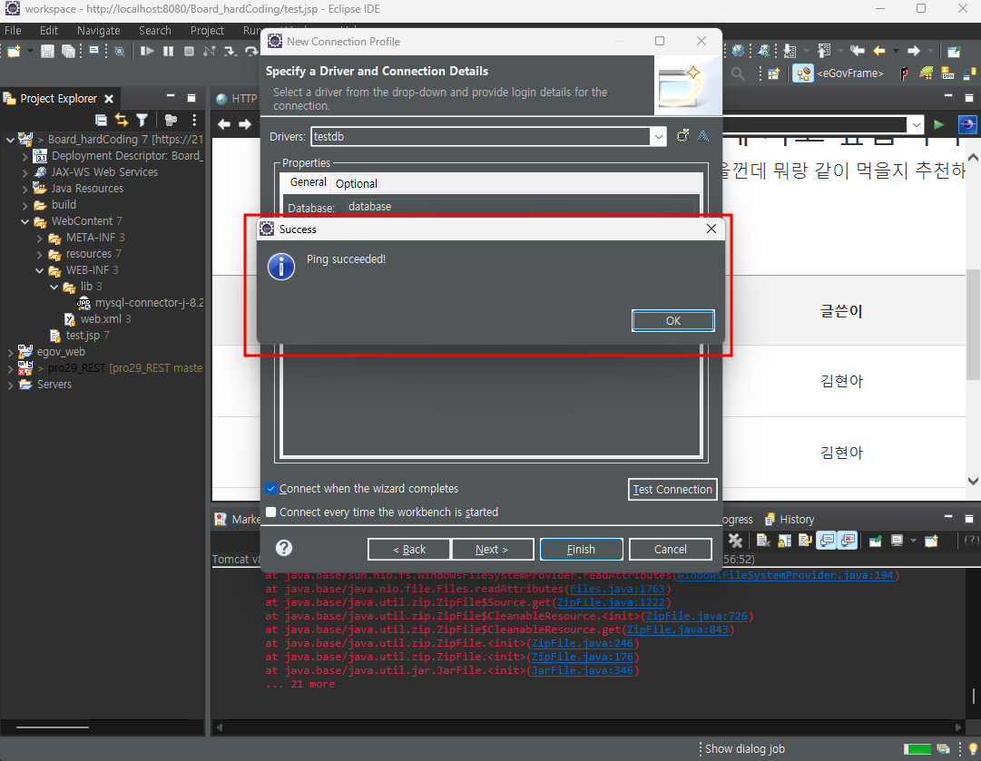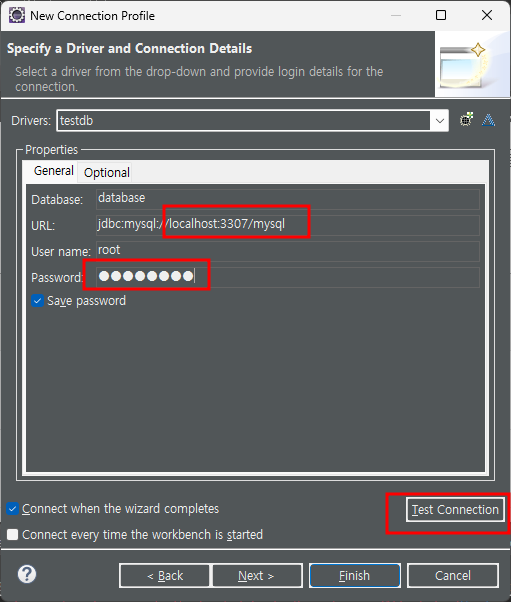 앞서 MariaDB설치/세팅시 설정했던 port번호와 database이름/ password를 넣고 - Test Connection - 성공시 완료
