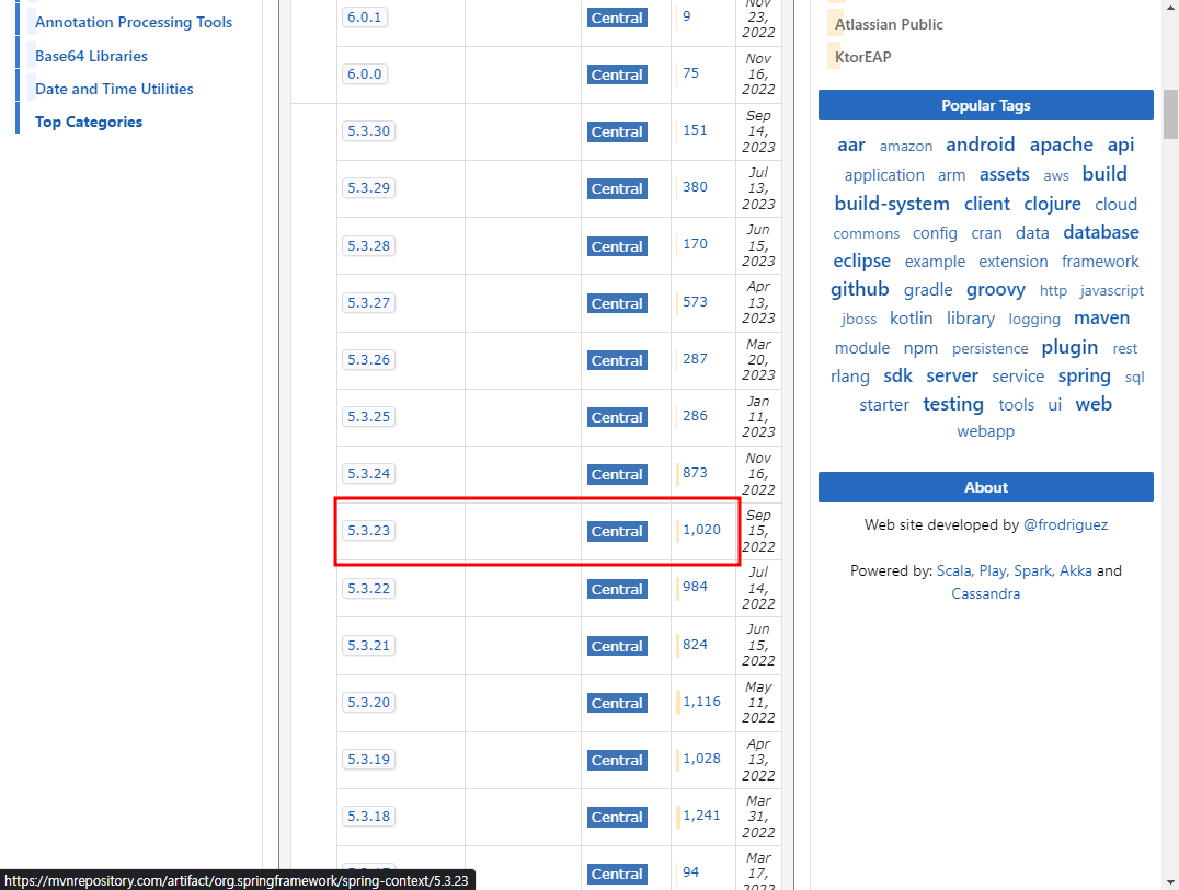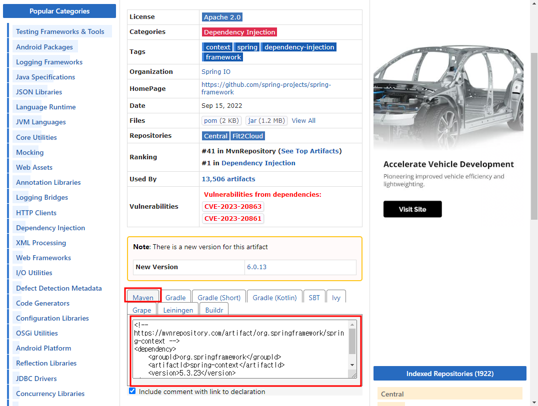 링크접속 - 원하는 라이브러리 검색 - 상세페이지 - 다운수가 많은 버전 선택 - Maven textarea 클릭 - 복사완료