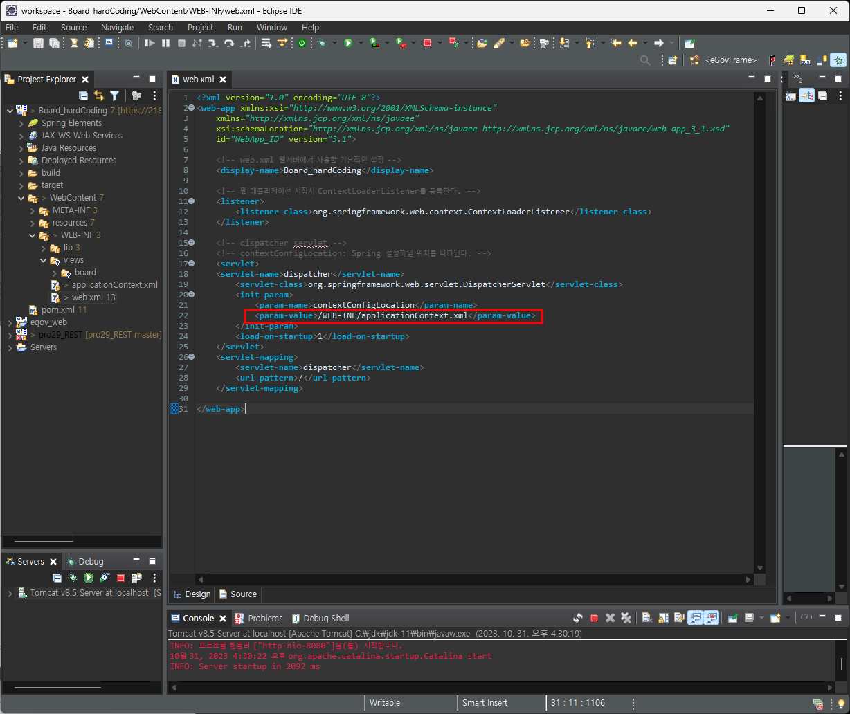 프로젝트를 생성한뒤, pom.xml를 통해 spring프레임워크를 주입했다면 본격적으로 화면을 띠워보자.