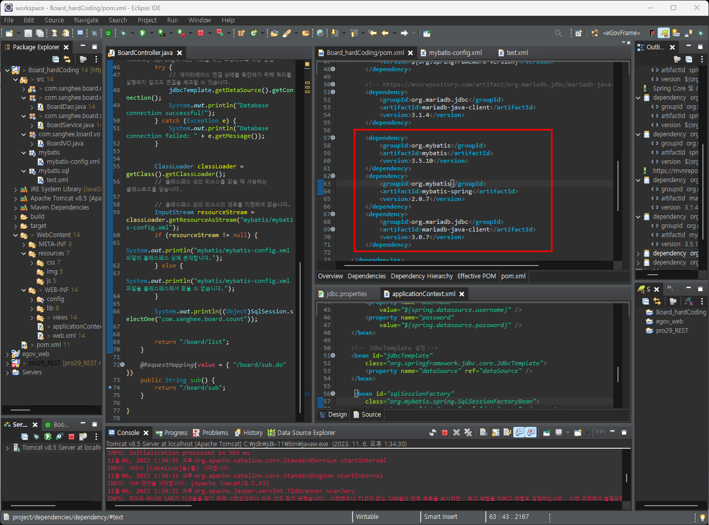 간단히 JDBC DB연결테스트를 해보자. pom.xml에 jdbc 라이브러리를 추가하고, Controller class에 JDBC 드라이버를 로드해 테스트한다. org.mariadb.jdbc mariadb-java-client 3.1.4 // JDBC 드라이버 로드 Class.forName("org.ma