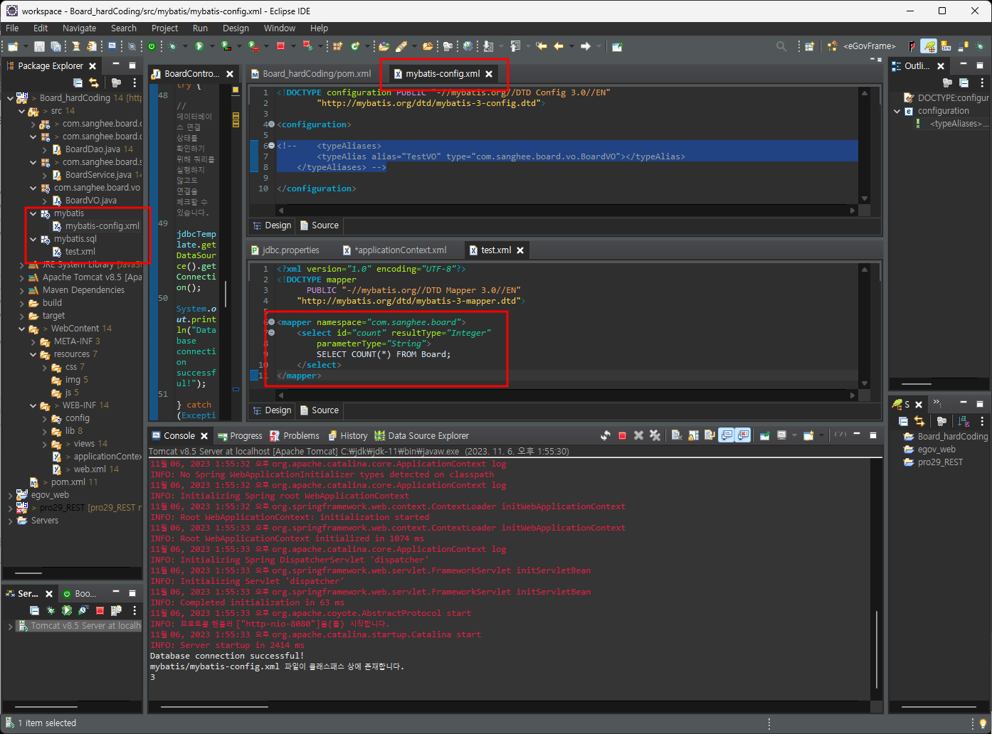 추후 VO등을 정의하기 위해 사용될 mybatis-config.xml를 만들고, 실제 동작할 sql이 든 test.xml를 생성해 간단히 작성해보자. 이때 실행될 sql은 미리 db 쿼리를 실행해 확인해보면 좋겠다.