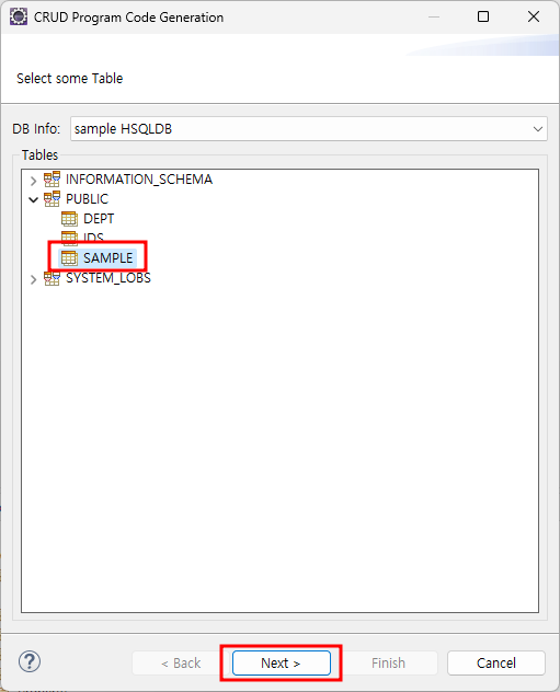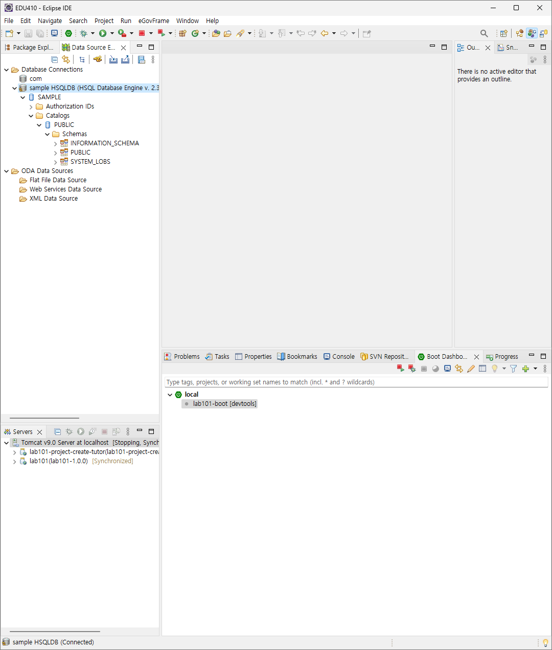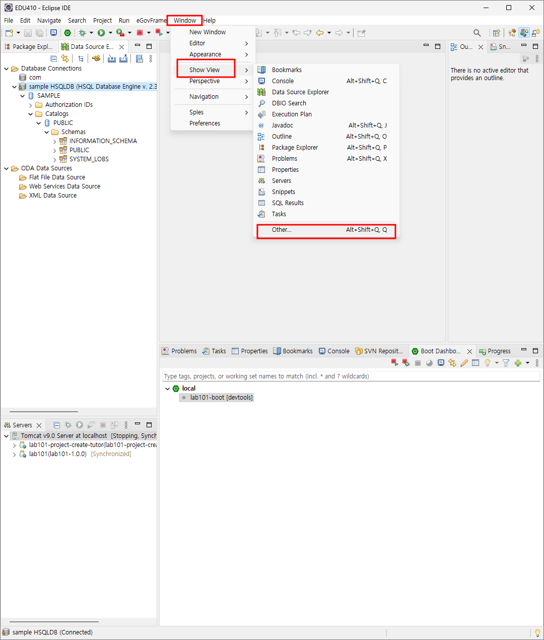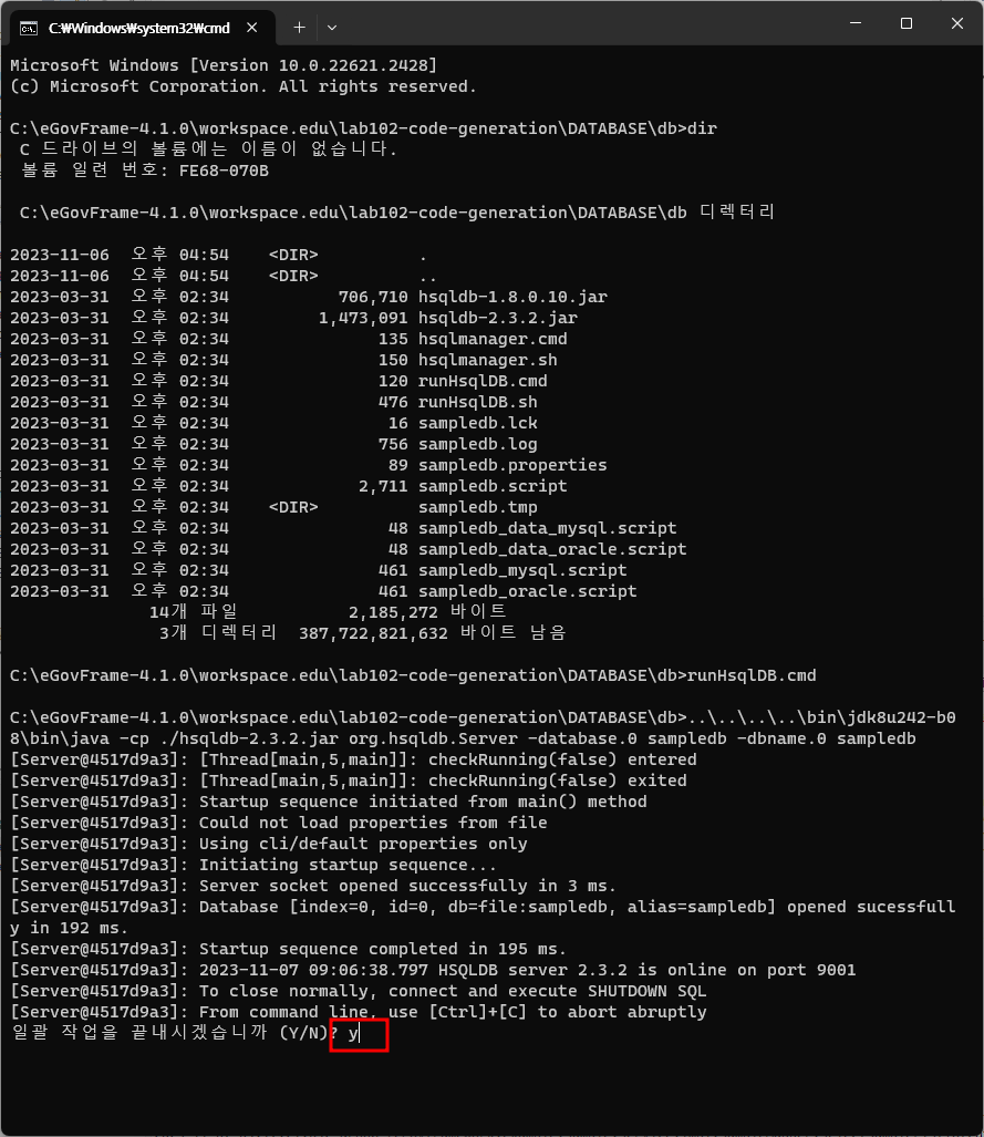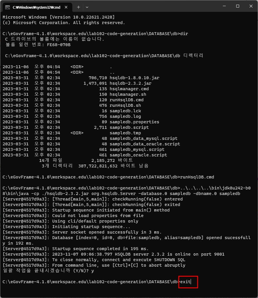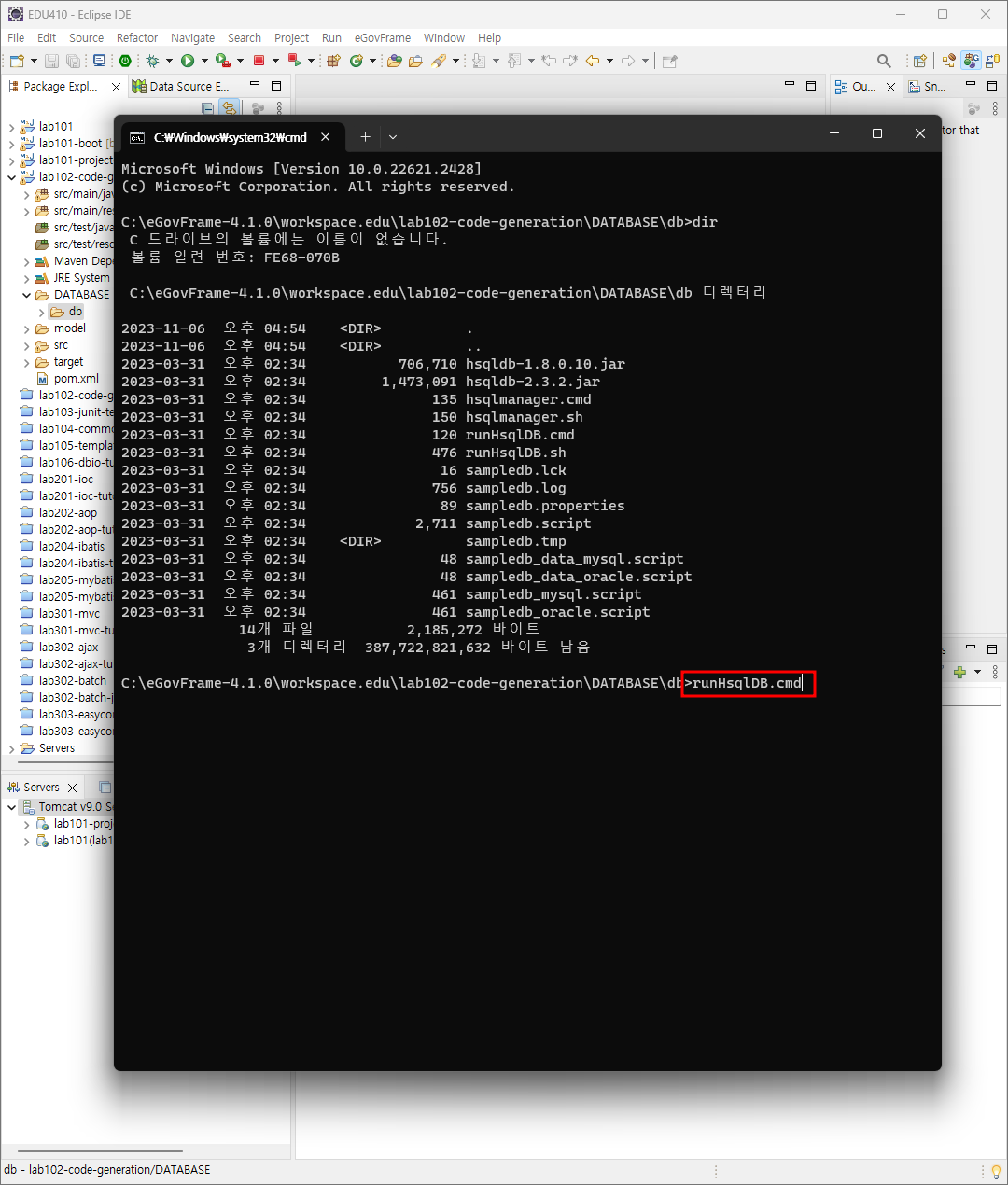 DIR로 디렉터리 확인 후 - runHsqlDB.cmd 실행 - db실행 완료