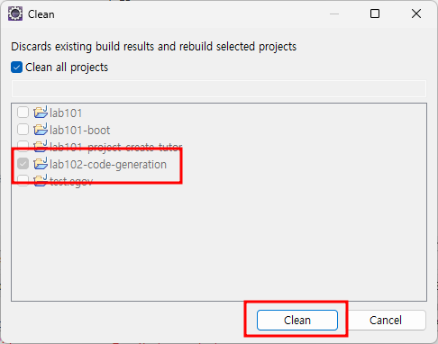 + 실행시 오류가 난다면 clean을 진행한다.