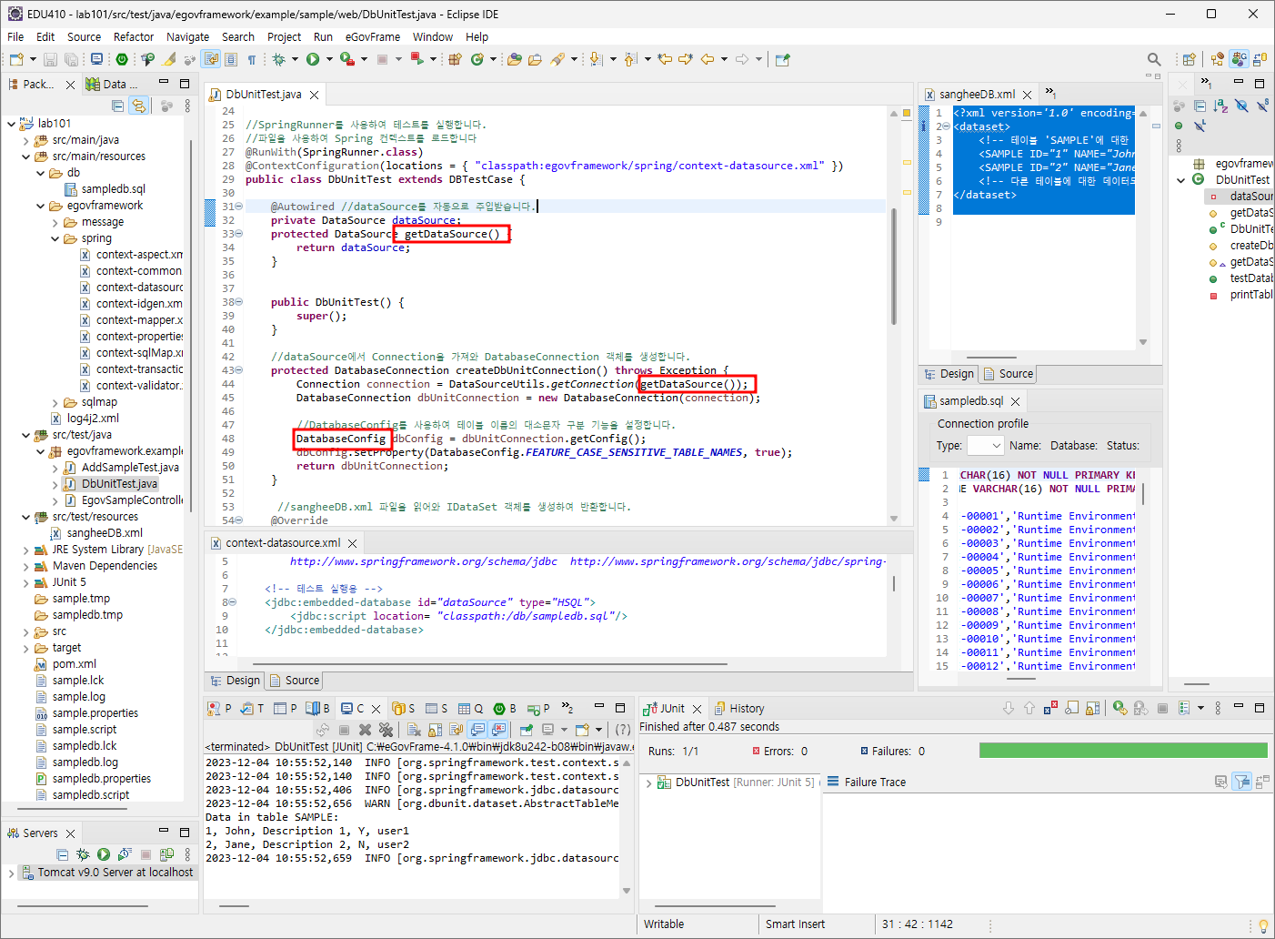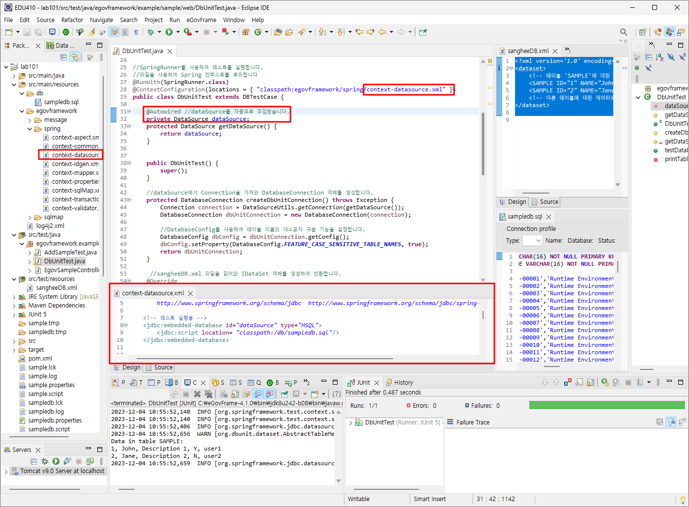 ontext-datasource.xml을 가져다 @ContextConfigureation을 통해 파일을 이용한 Spring context로 로드해