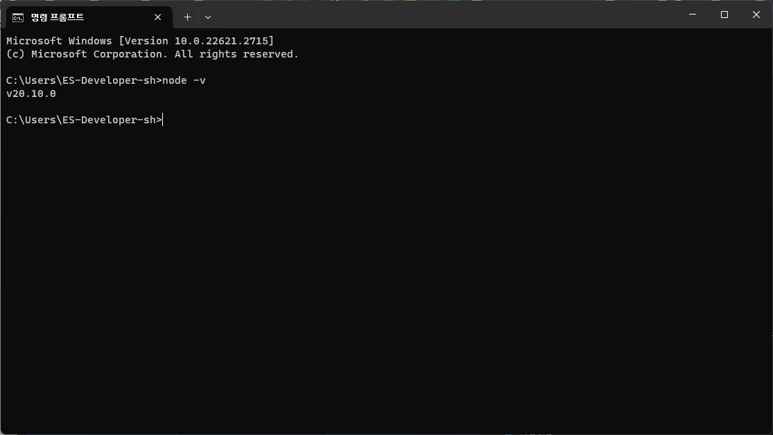 cmd를 켜 명령해 Node.js가 잘 깔렸는지 확인해보자.