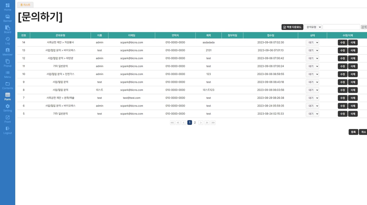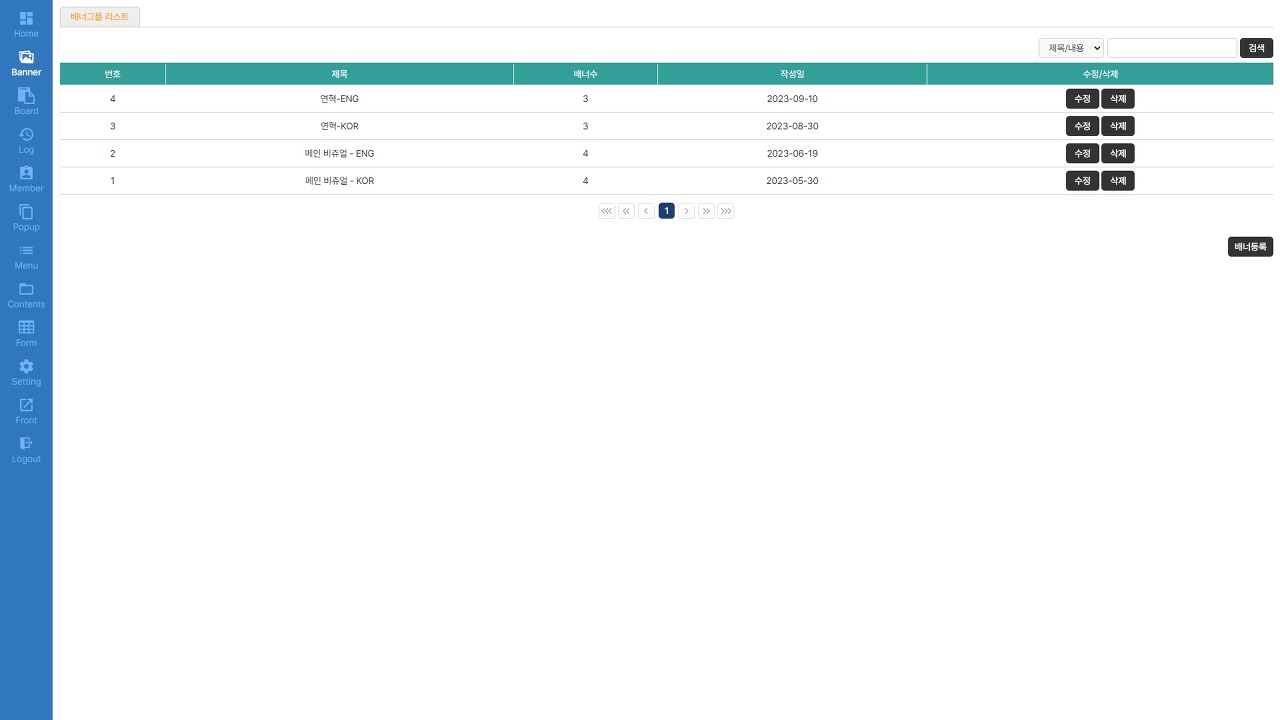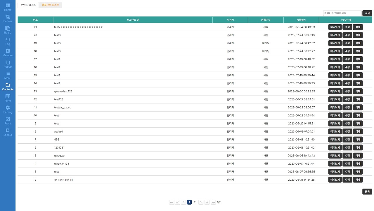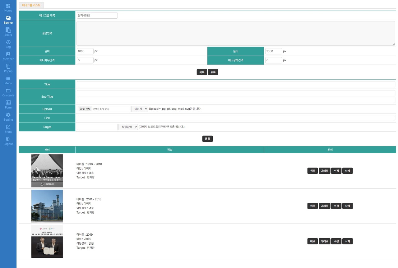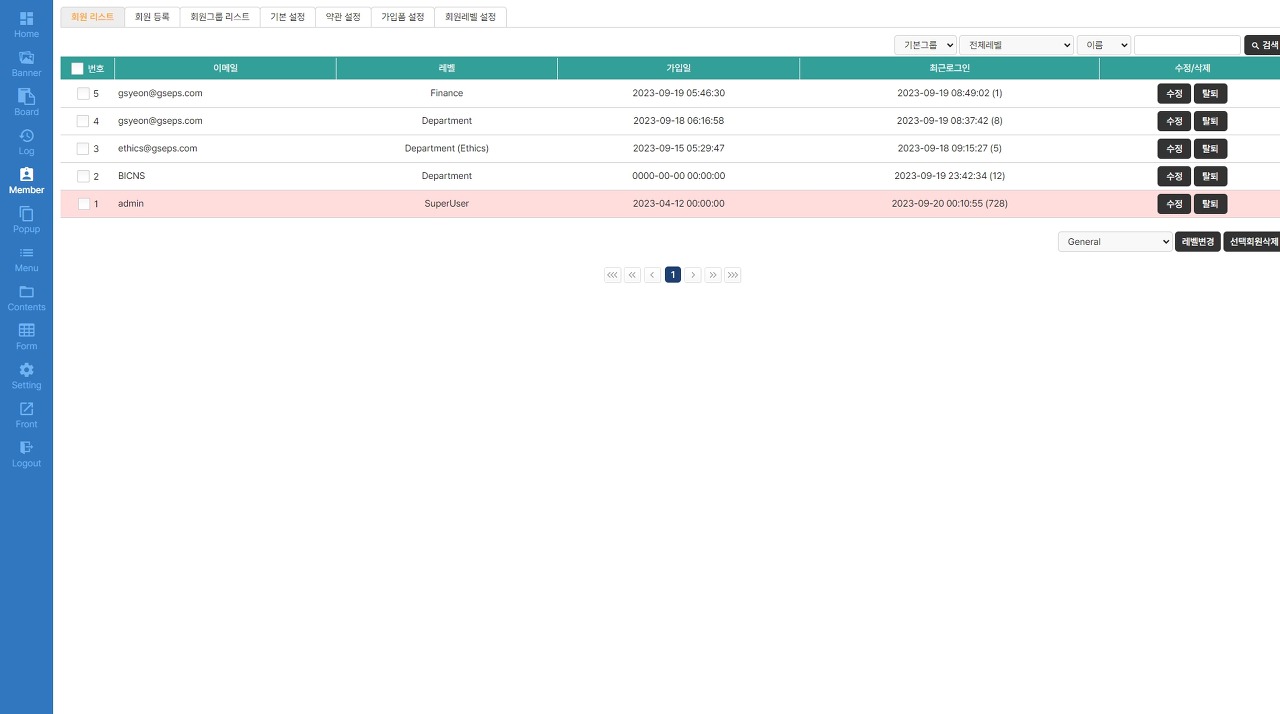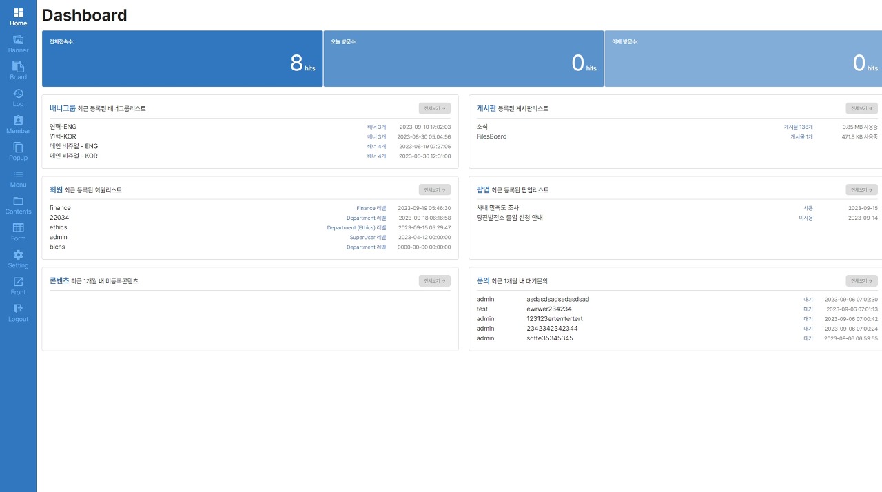 슈퍼/현업 관리자로 크게 나뉘며 홈페이지 관리, 회원관리 및 문의관리, 게시판관리 등의 기능을 가집니다.