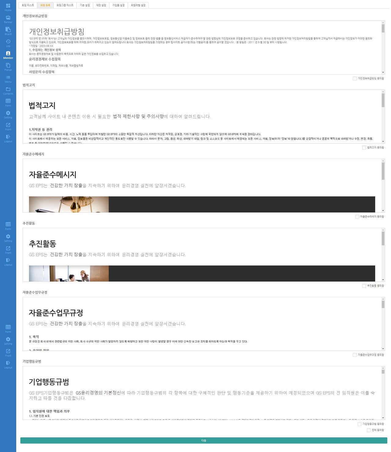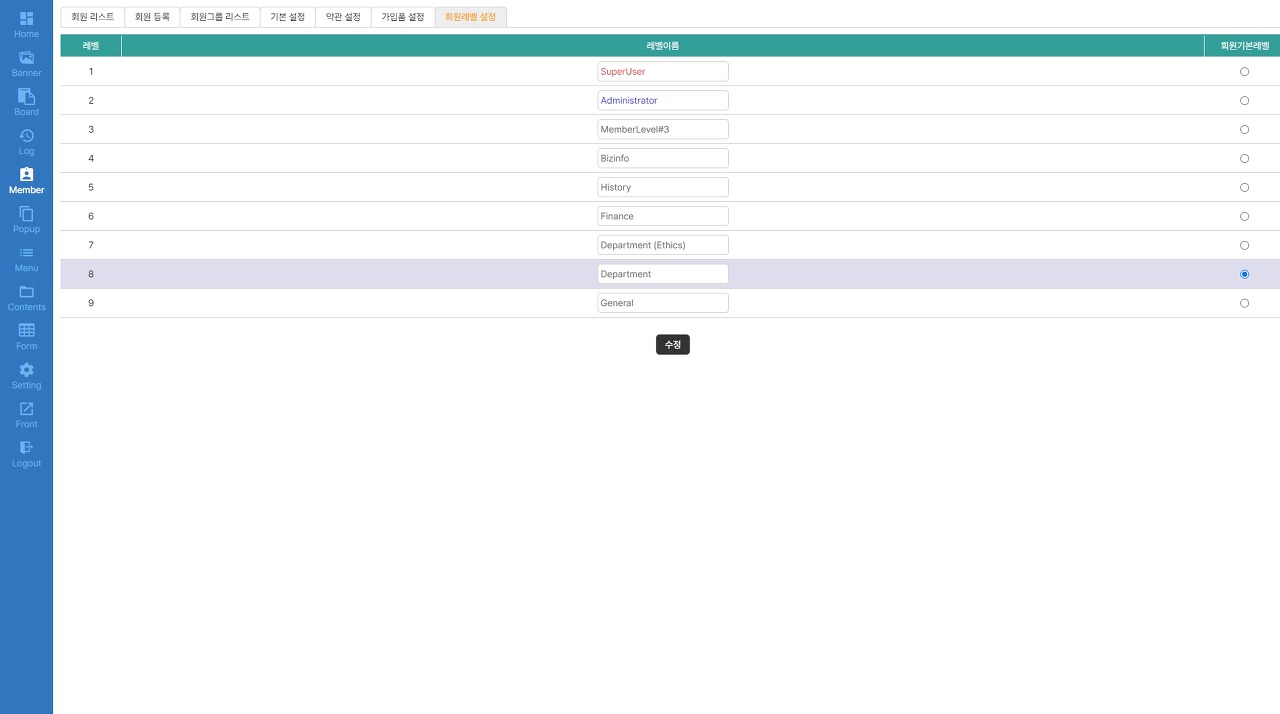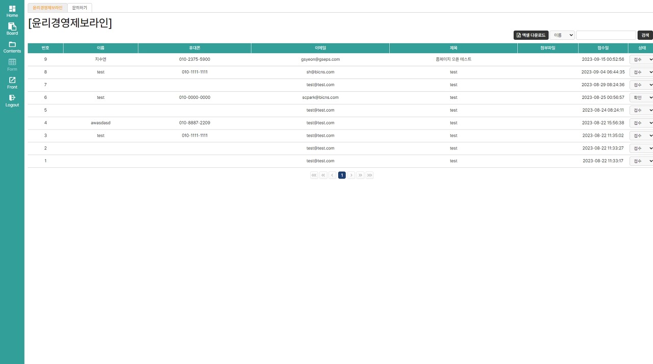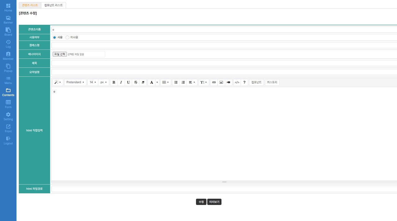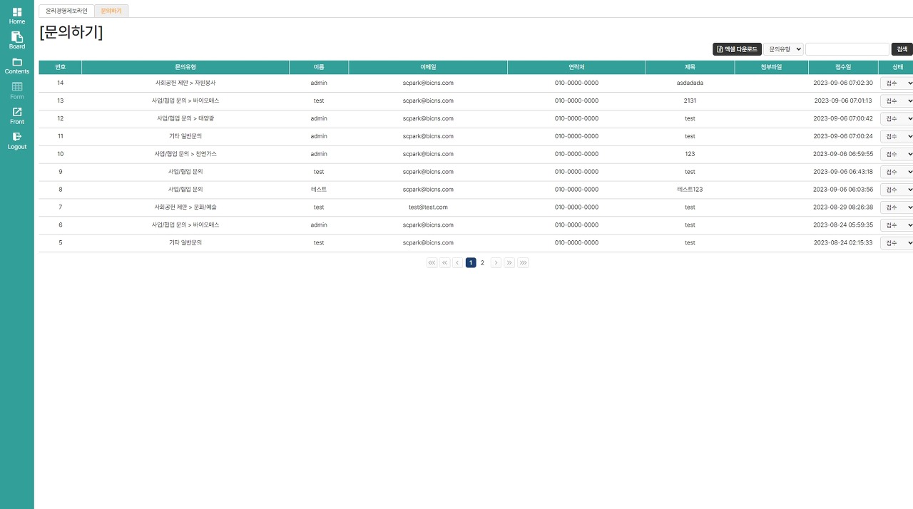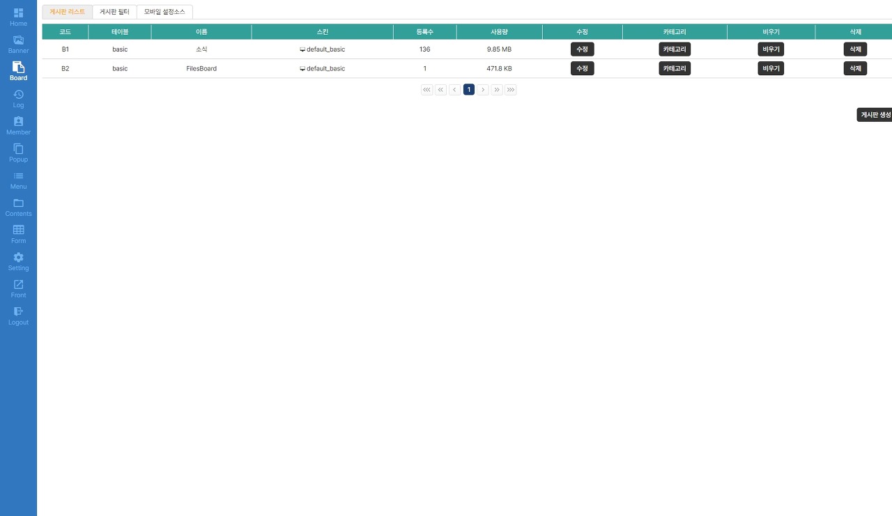 슈퍼/현업 관리자로 크게 나뉘며 홈페이지 관리, 회원관리 및 문의관리, 게시판관리 등의 기능을 가집니다.