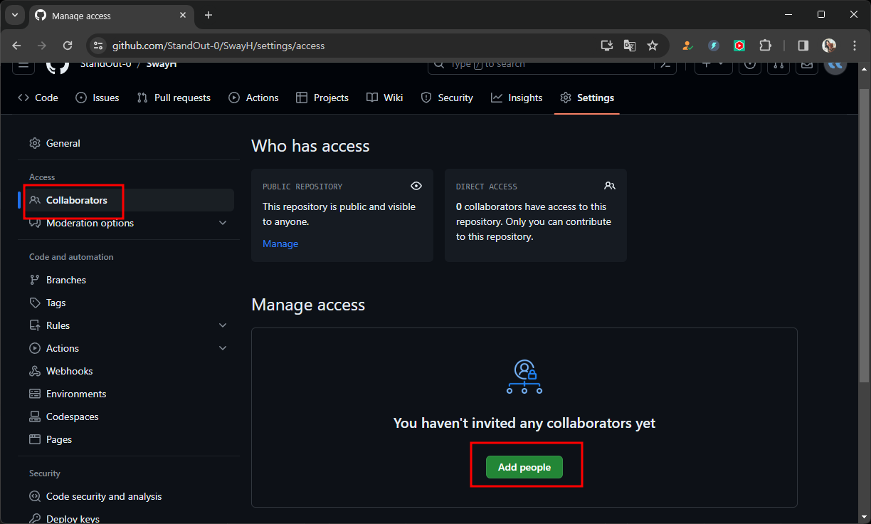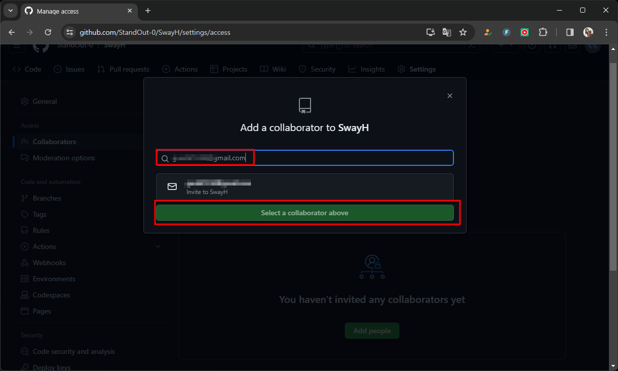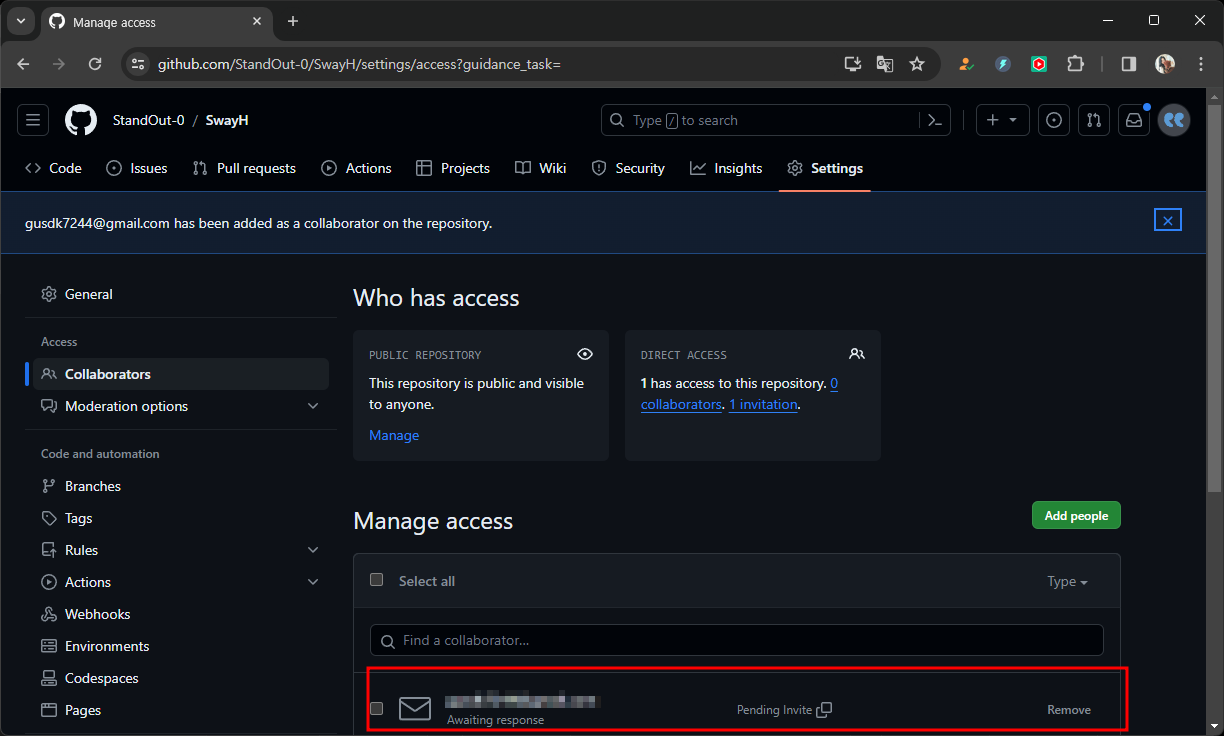 생성한 레퍼지토리 - 설정 - Collaborators - 추가 - 이메일입력 - 추가