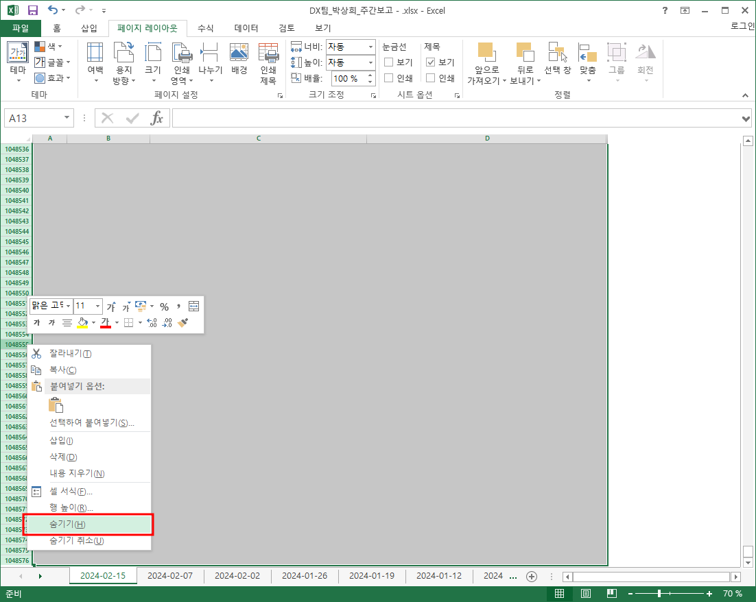 마우스오른쪽 - 숨기기