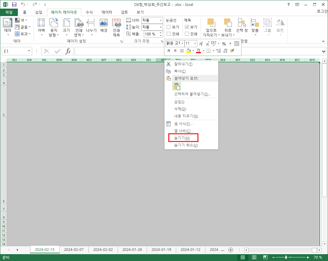엑셀 가로 스크롤 사라짐