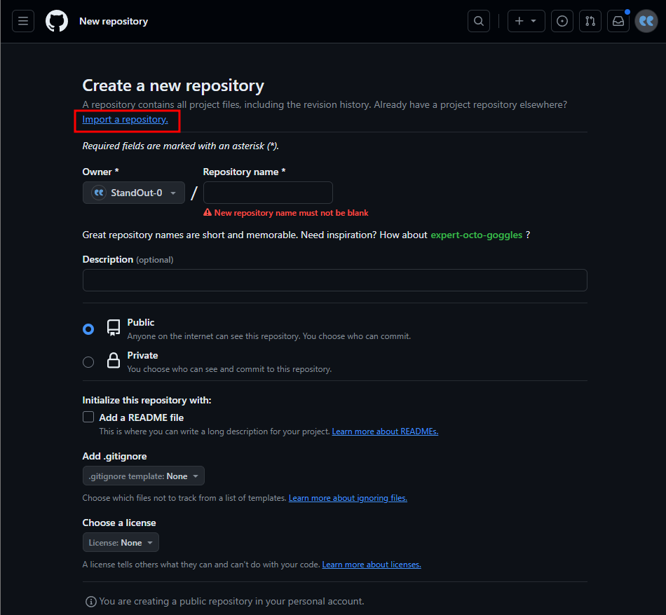 복사한 https url 붙여넣기 - 이름지정 - Public/Private지정 - Begin import