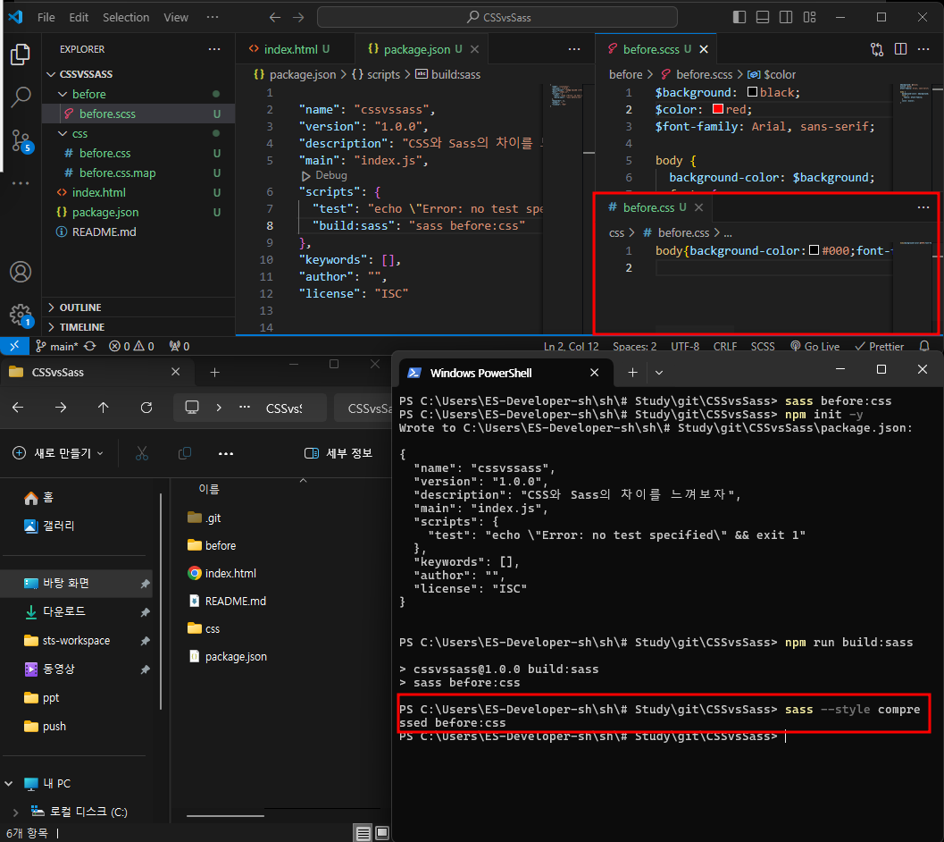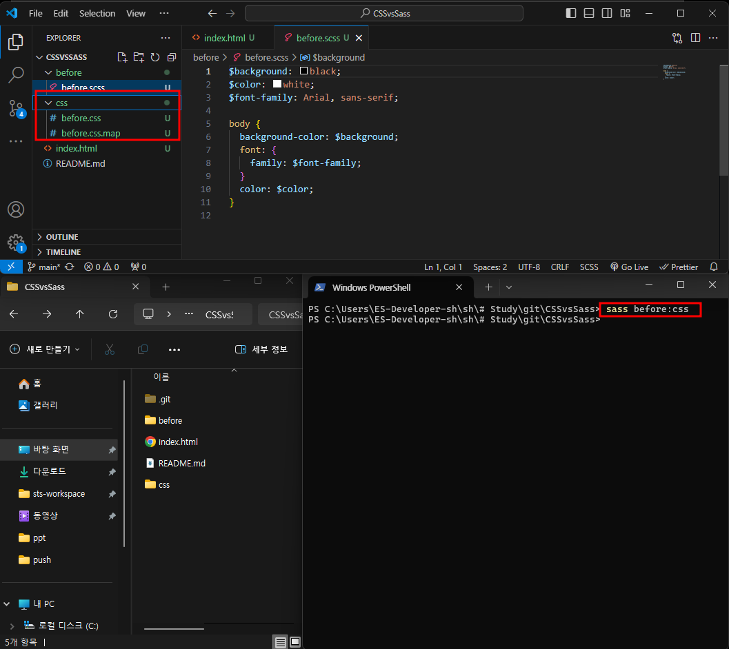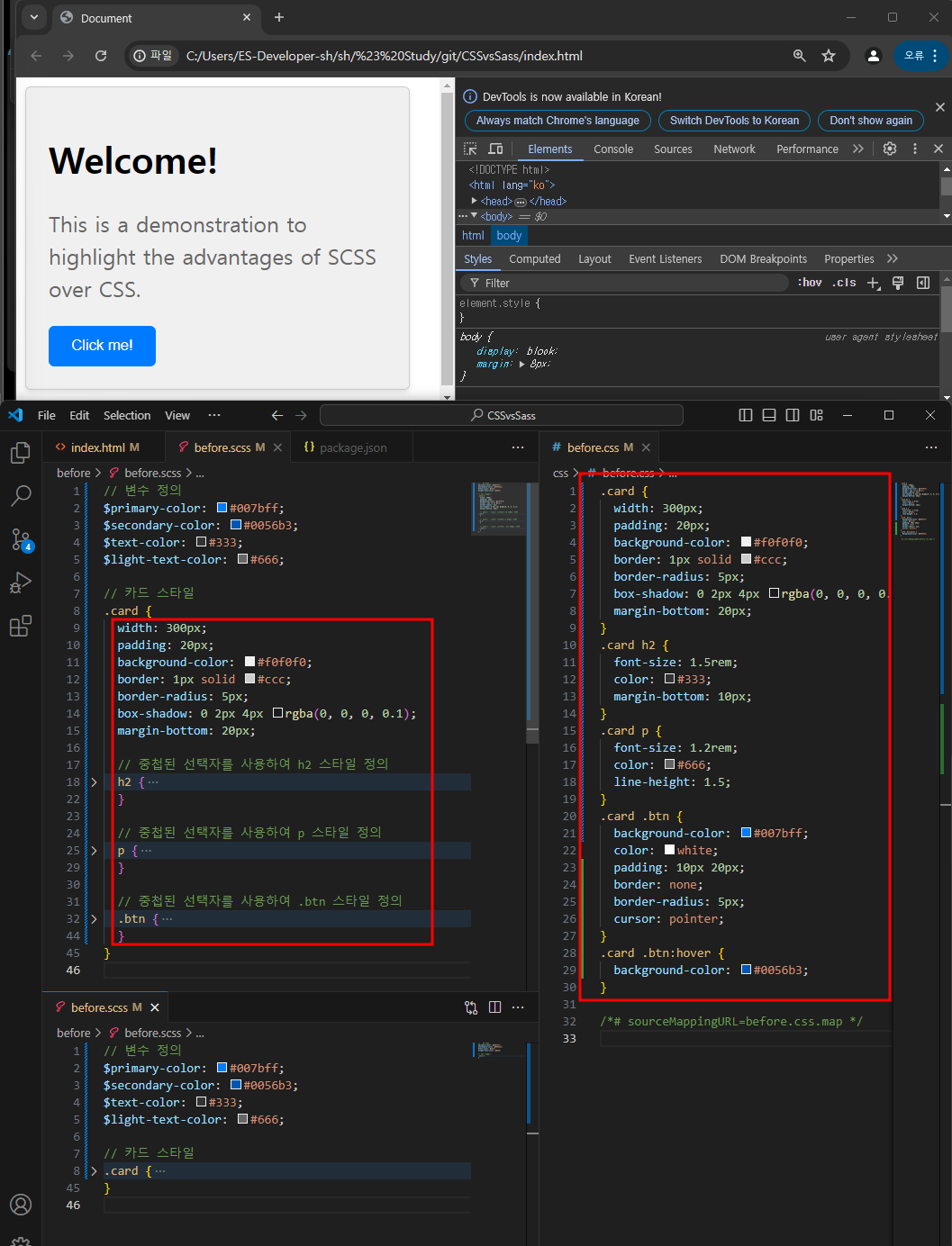 scss와 css를 열어 비교해보자.