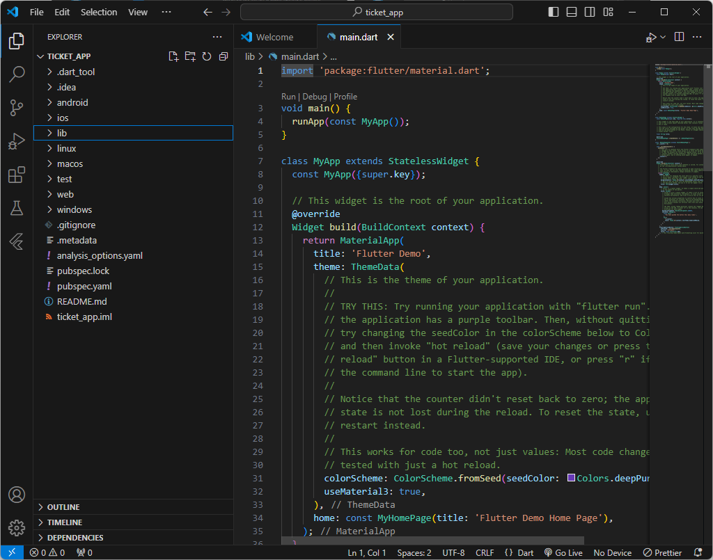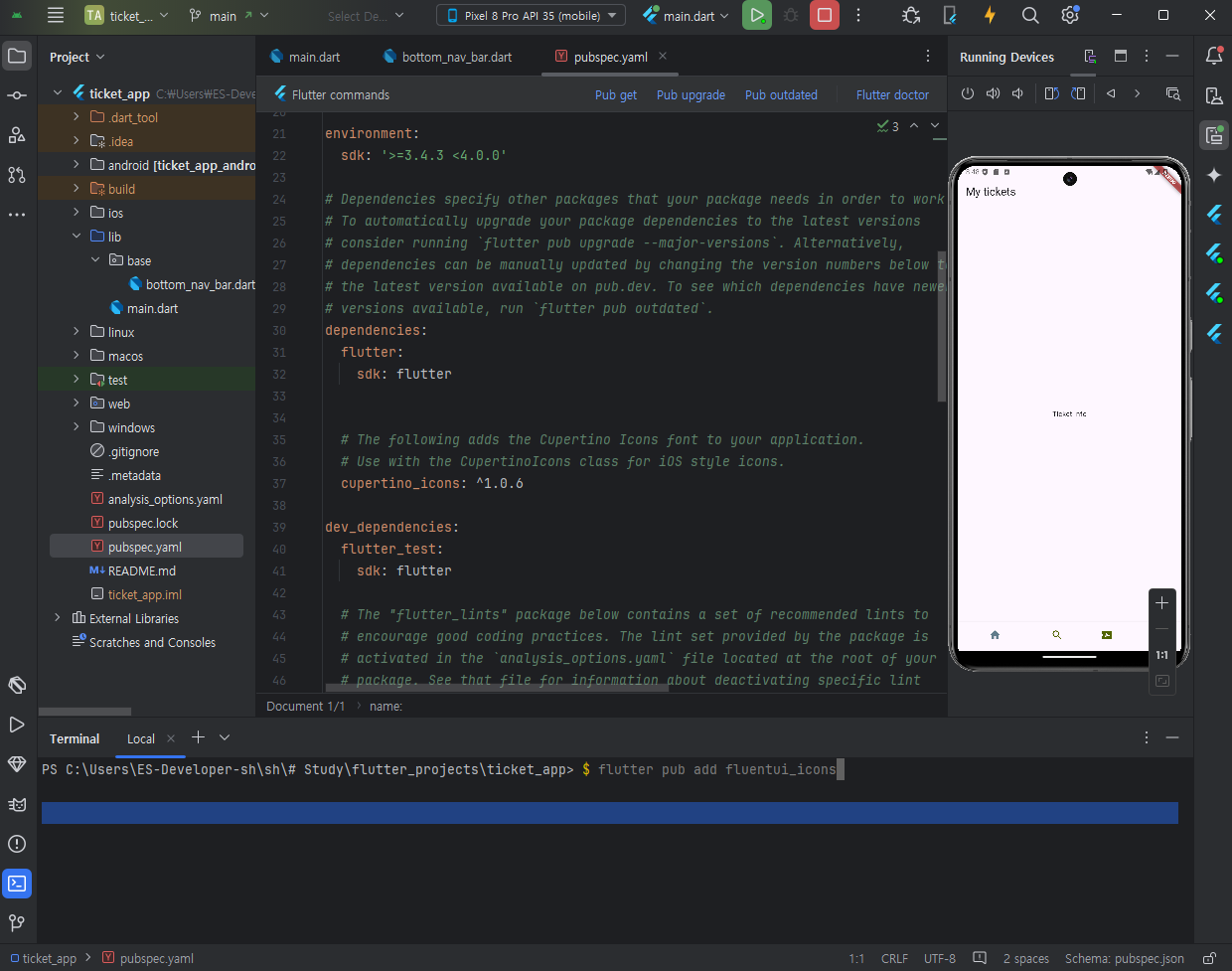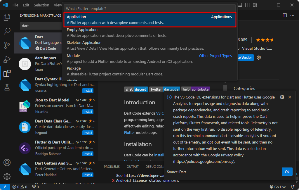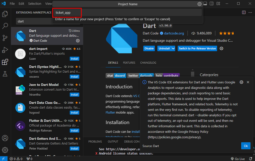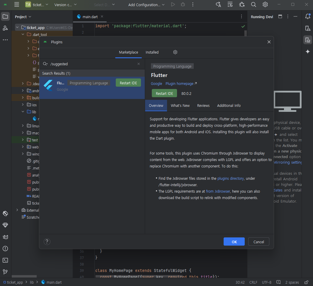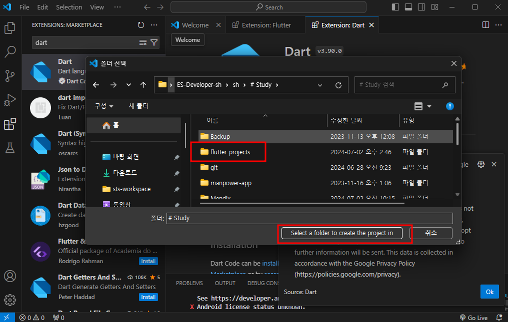 + flutter도 없을경우 install하라고 오른쪽 하단에 알림이 뜰것이다. 설치 - restart ide
