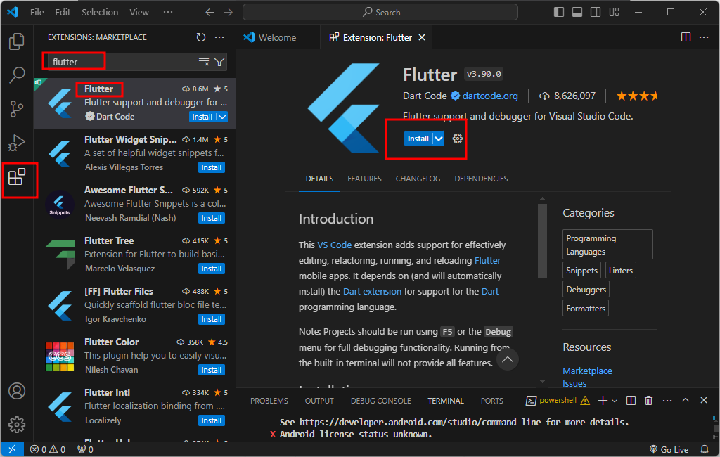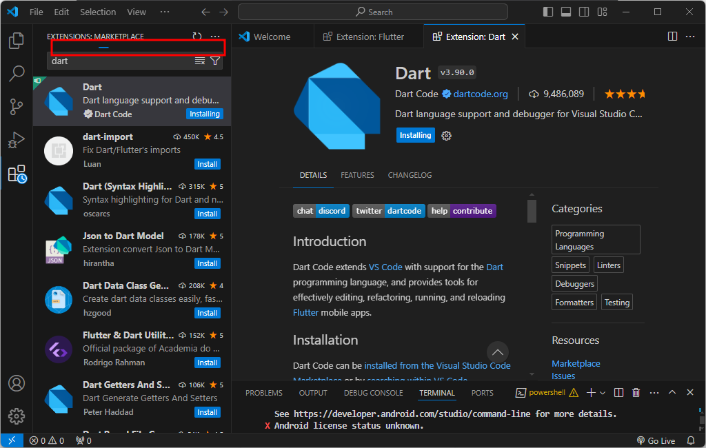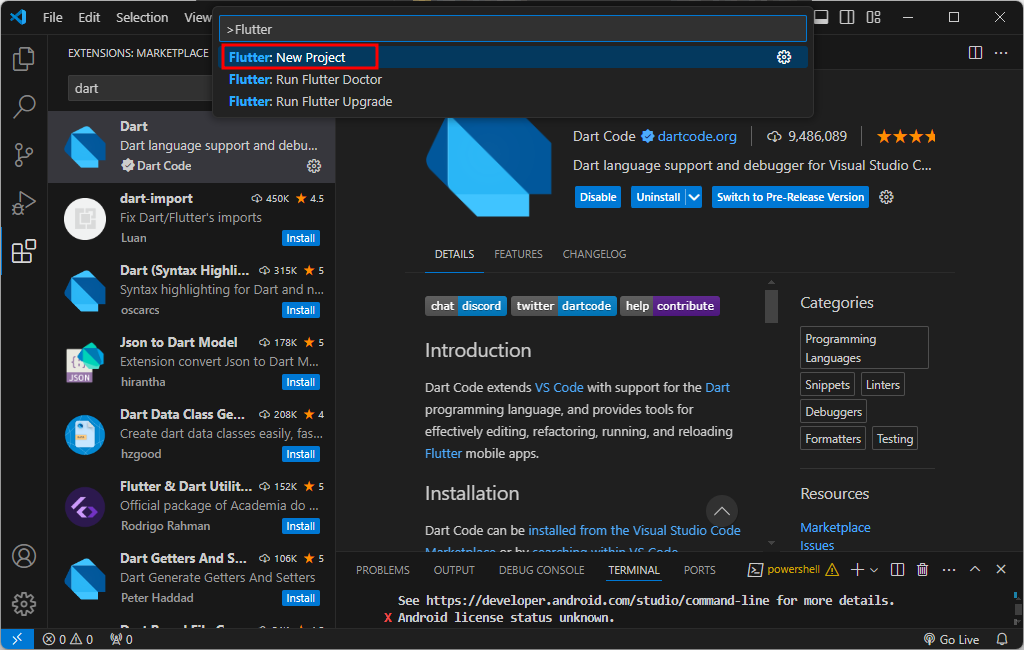 vscode 마켓플레이스 - Flutter install