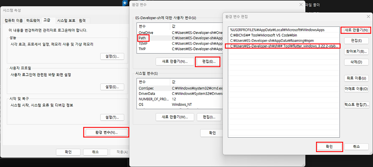 flutter 압축풀기 -> 환경변수 등록 ( /bin 까지의 경로 )