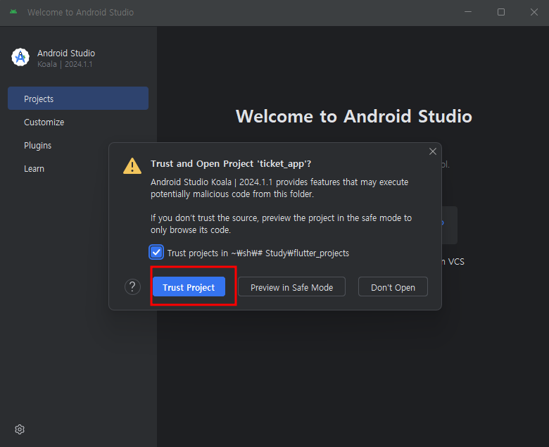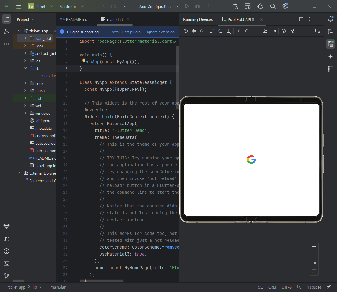 + run할때 dart plugin경고가 뜨면 install