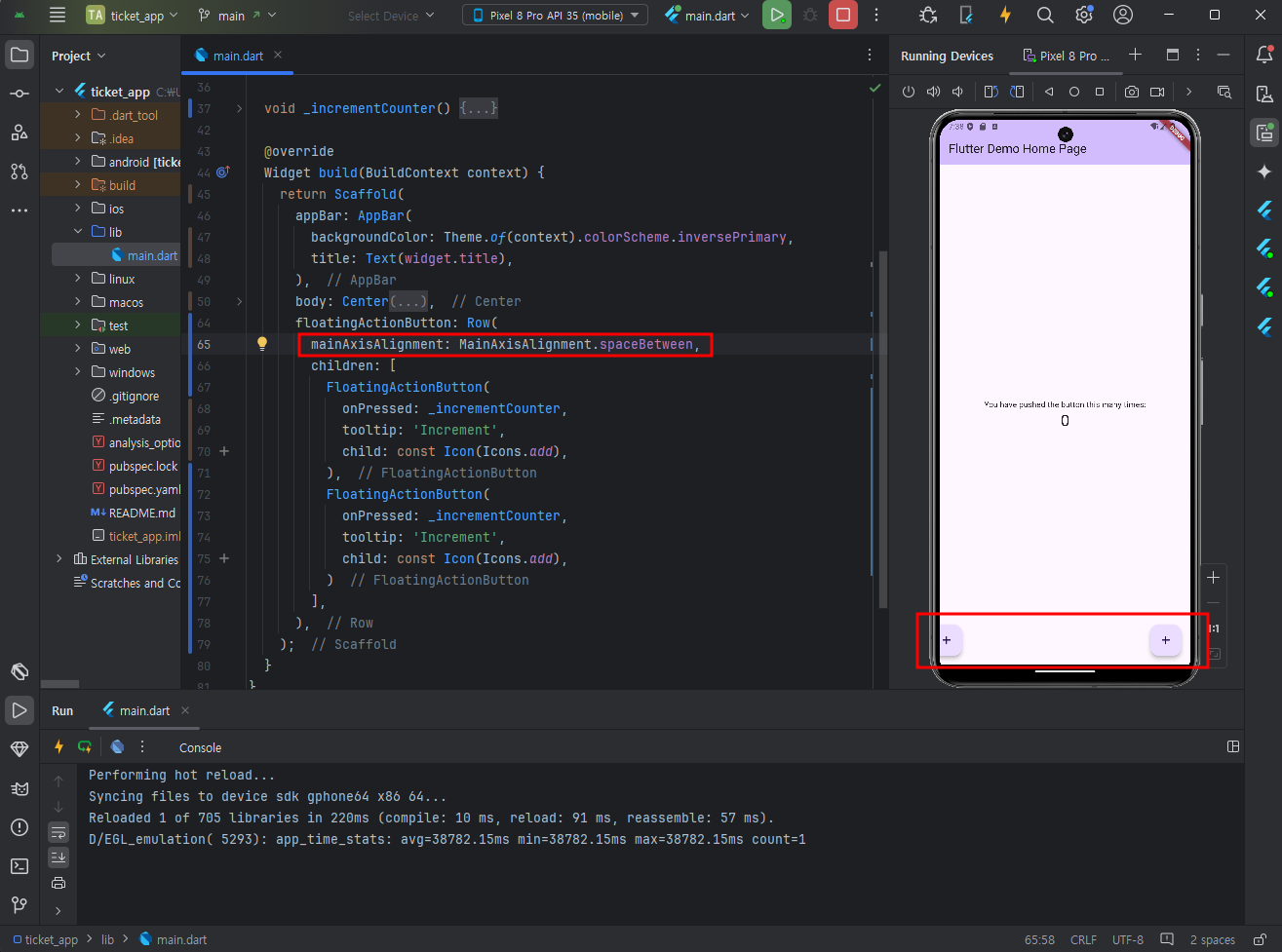 mainAxisAlignment의 속성값으로 정렬을 달리할 수 있다.