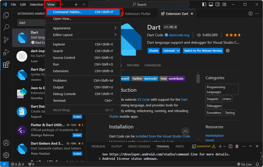 Flutter가 installed 되면 Dart도 함께 installed 된다. 확인.