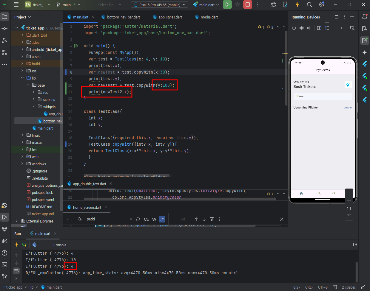 아래결과를 보면 copyWith() 이후로도 본래의 x 값을 손상없이 출력할 수있다.