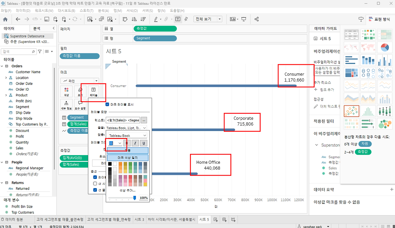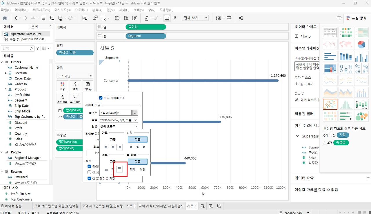 레이블설정 - 라인끝 + 정렬