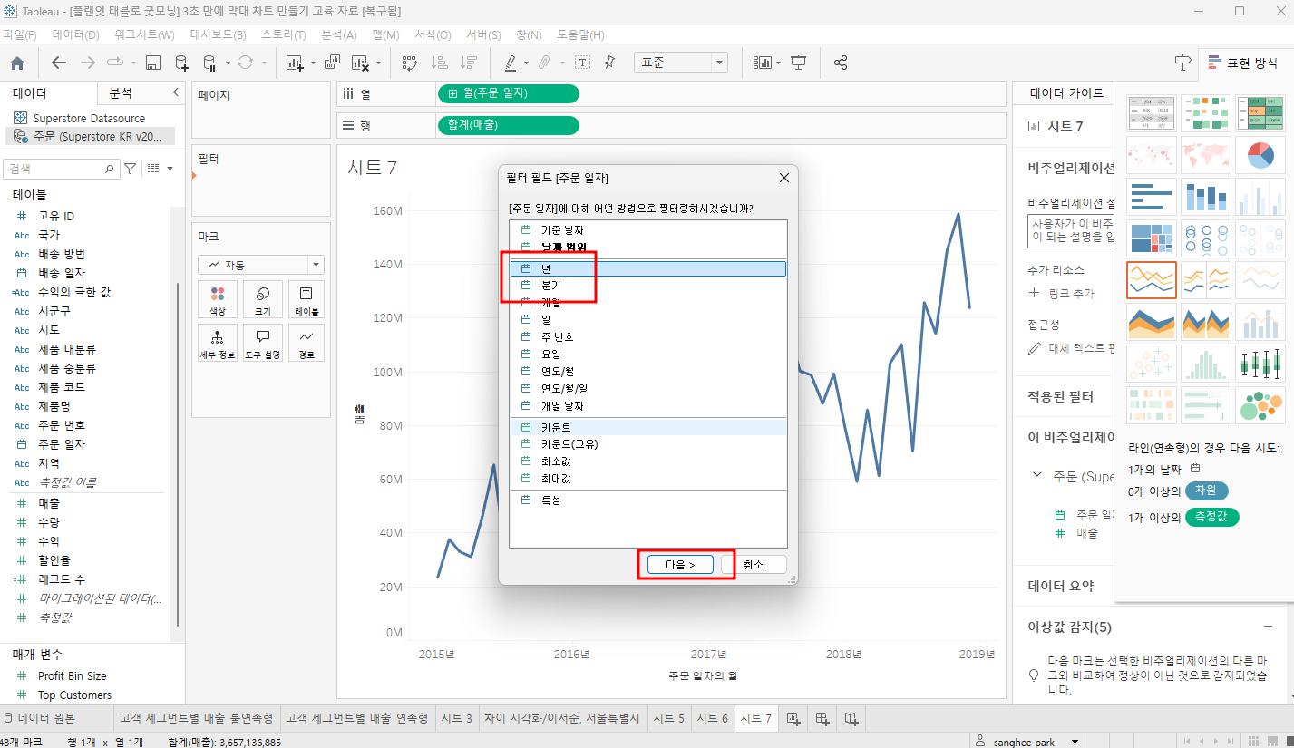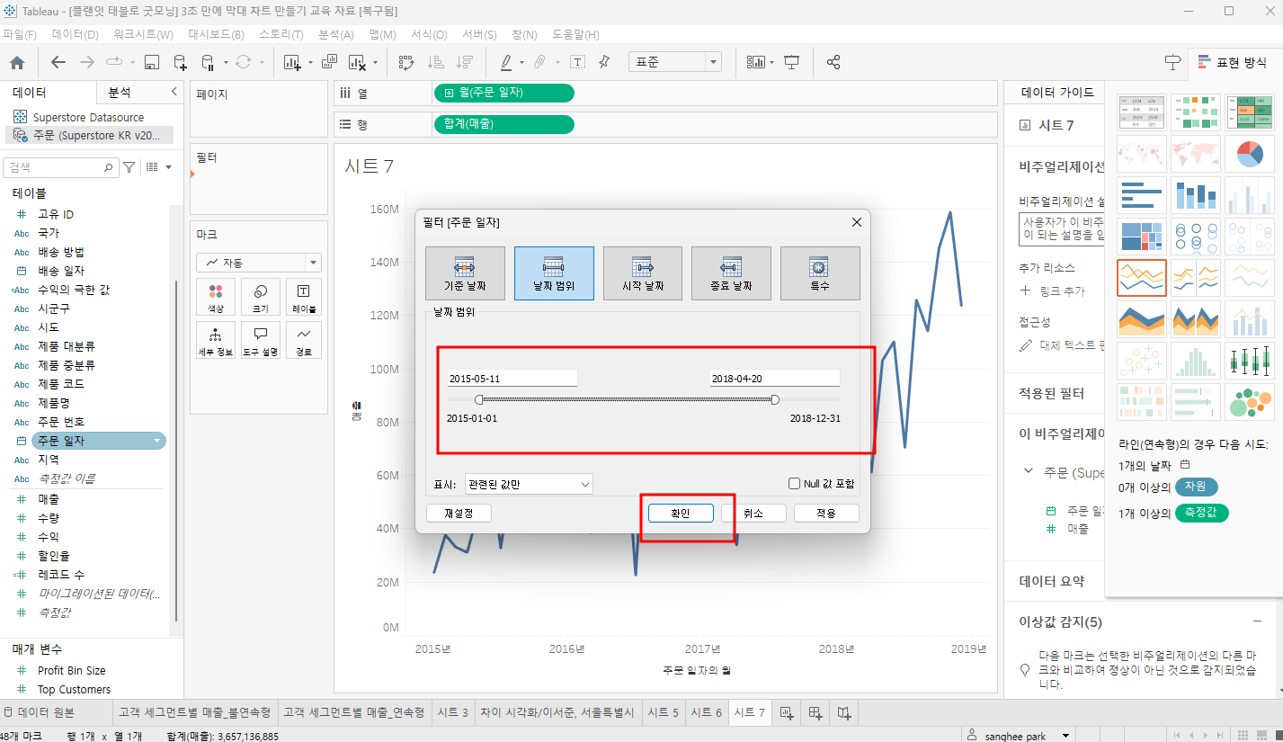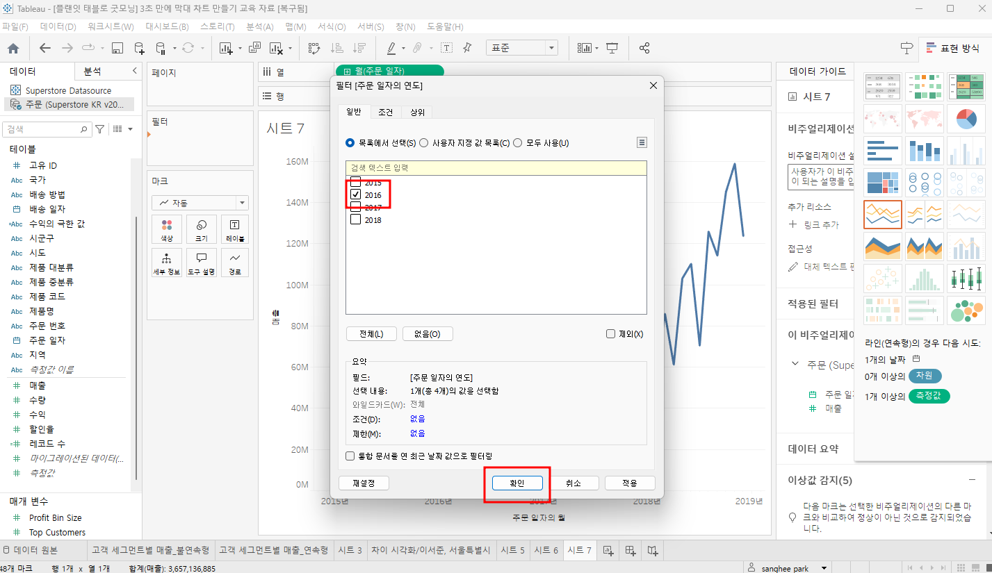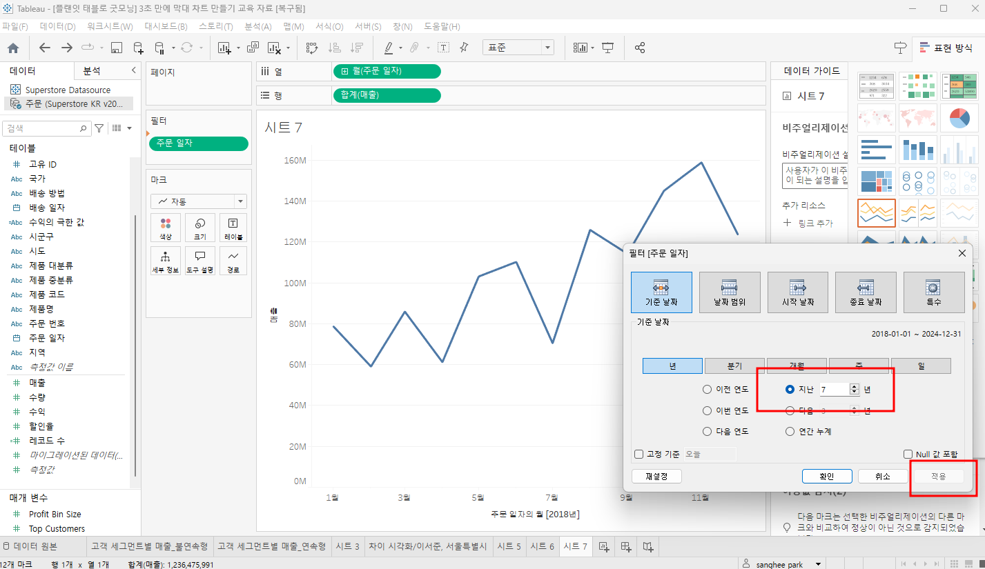 적용클릭시 필터창을 켜놓은 상태에서 그래프 변화를 확인 할 수 있다.