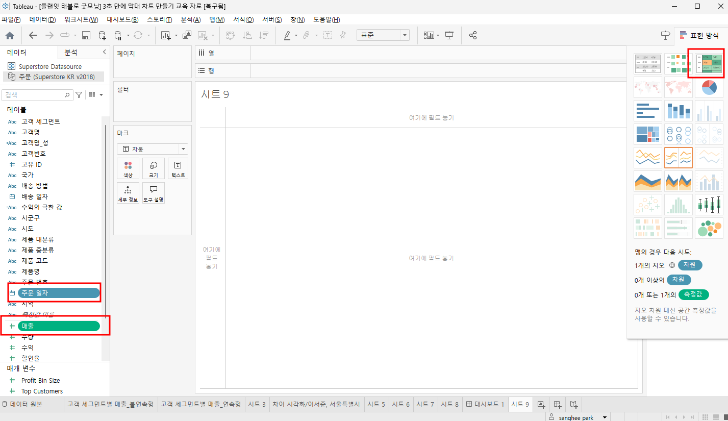 alt를 누른상태에서 데이터 클릭 - 하이라이터 테이블 클릭