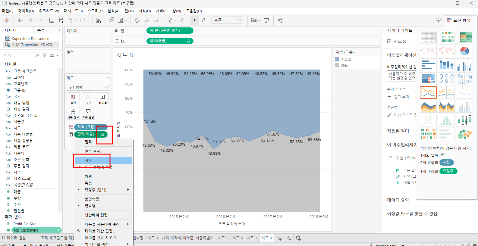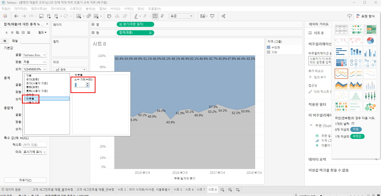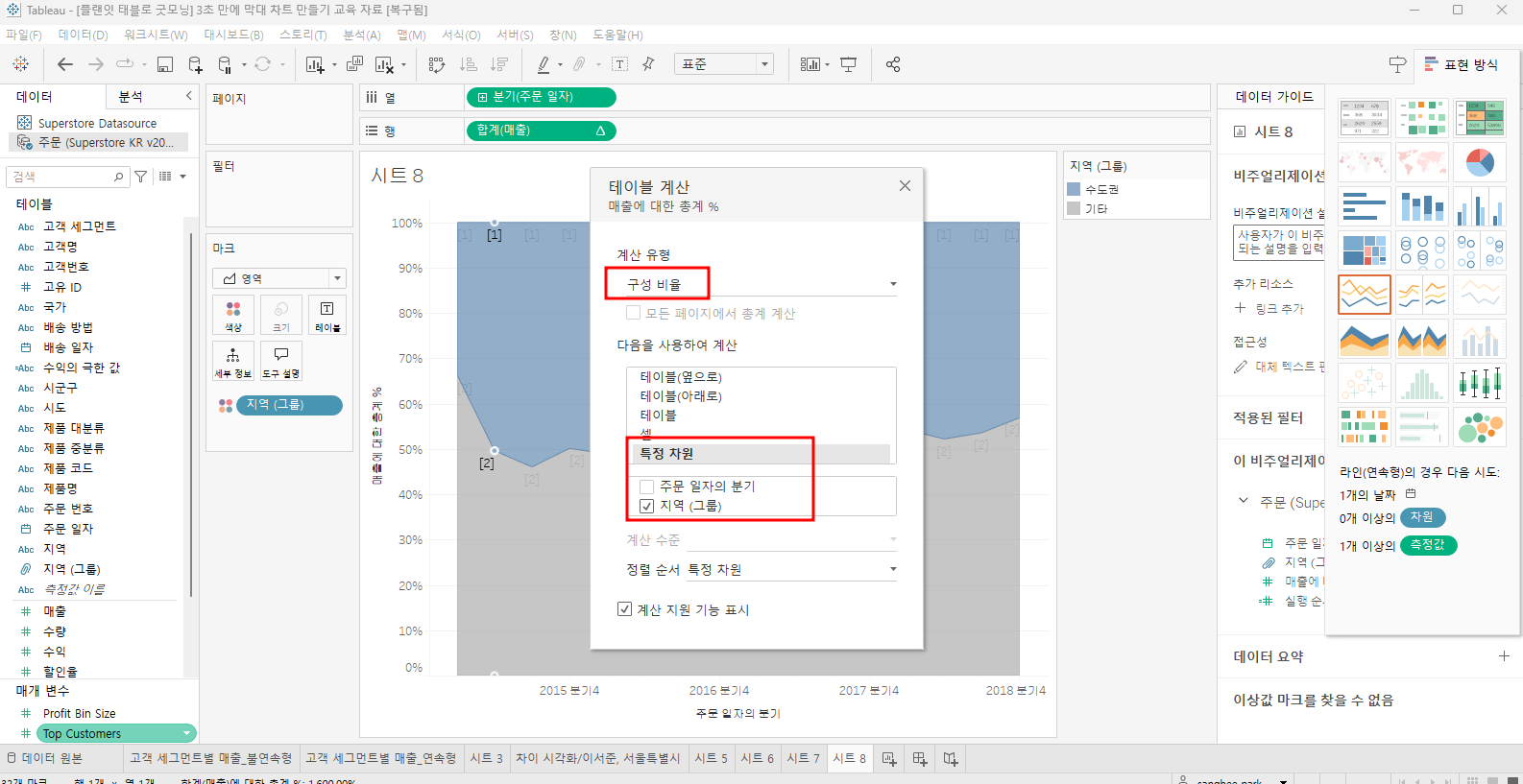 테이블 계산 추가 - %(구성비율)로 변경
