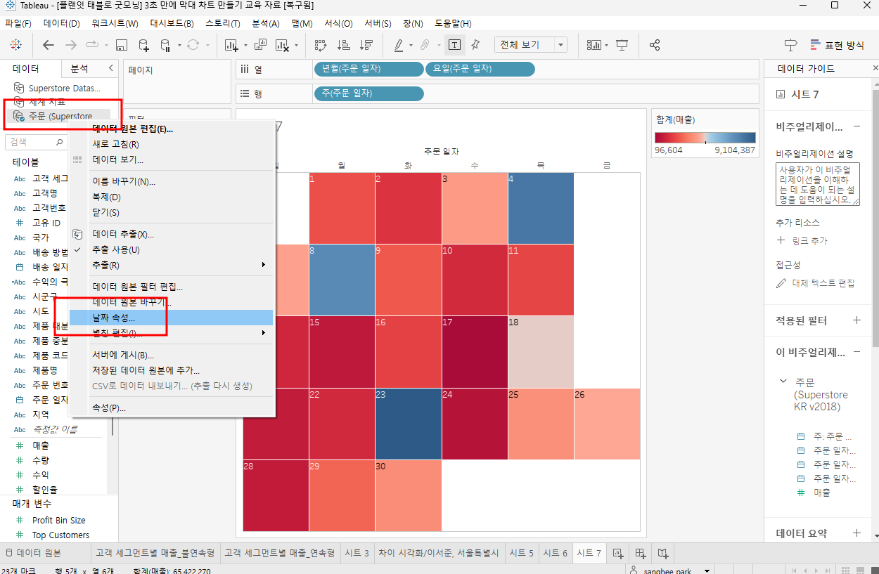 데이터 - 날짜속성 - 요일의 첫 순서 변경