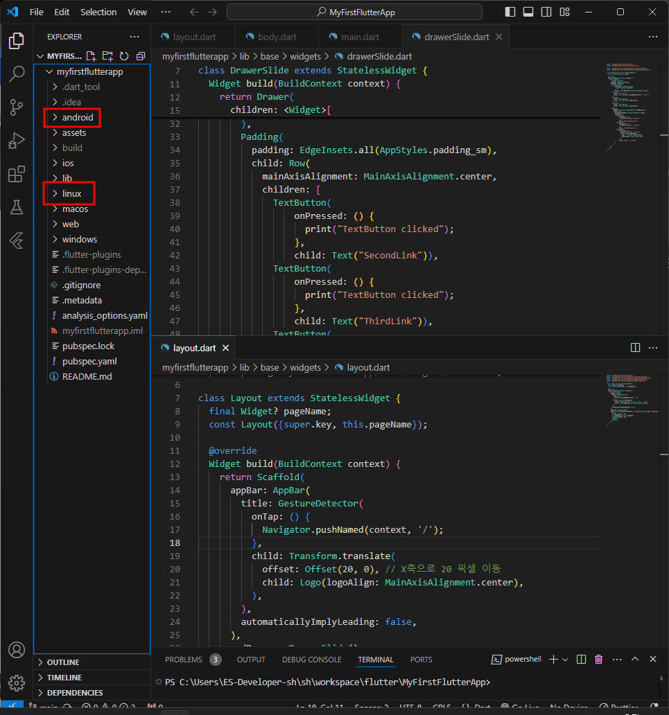 실제로 프로젝트를 생성시 안드로이드와 리눅스의 폴더/코드가 자동으로 추가된다.