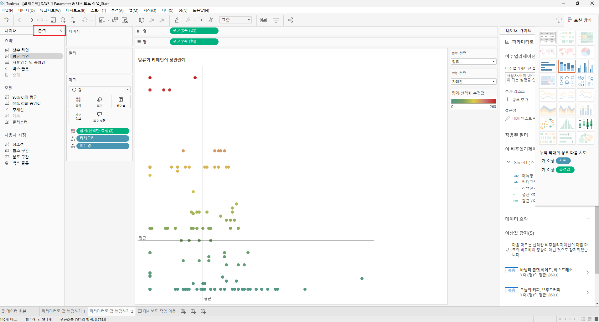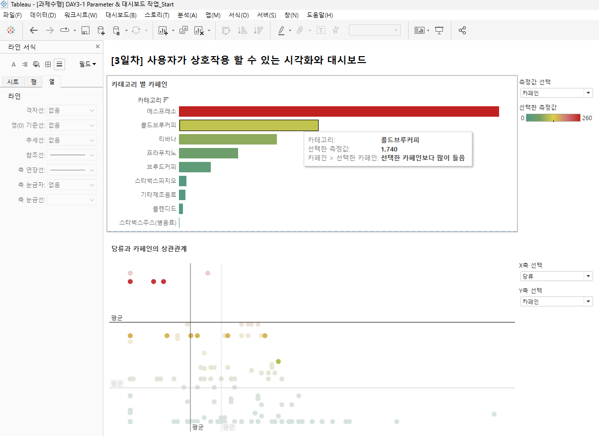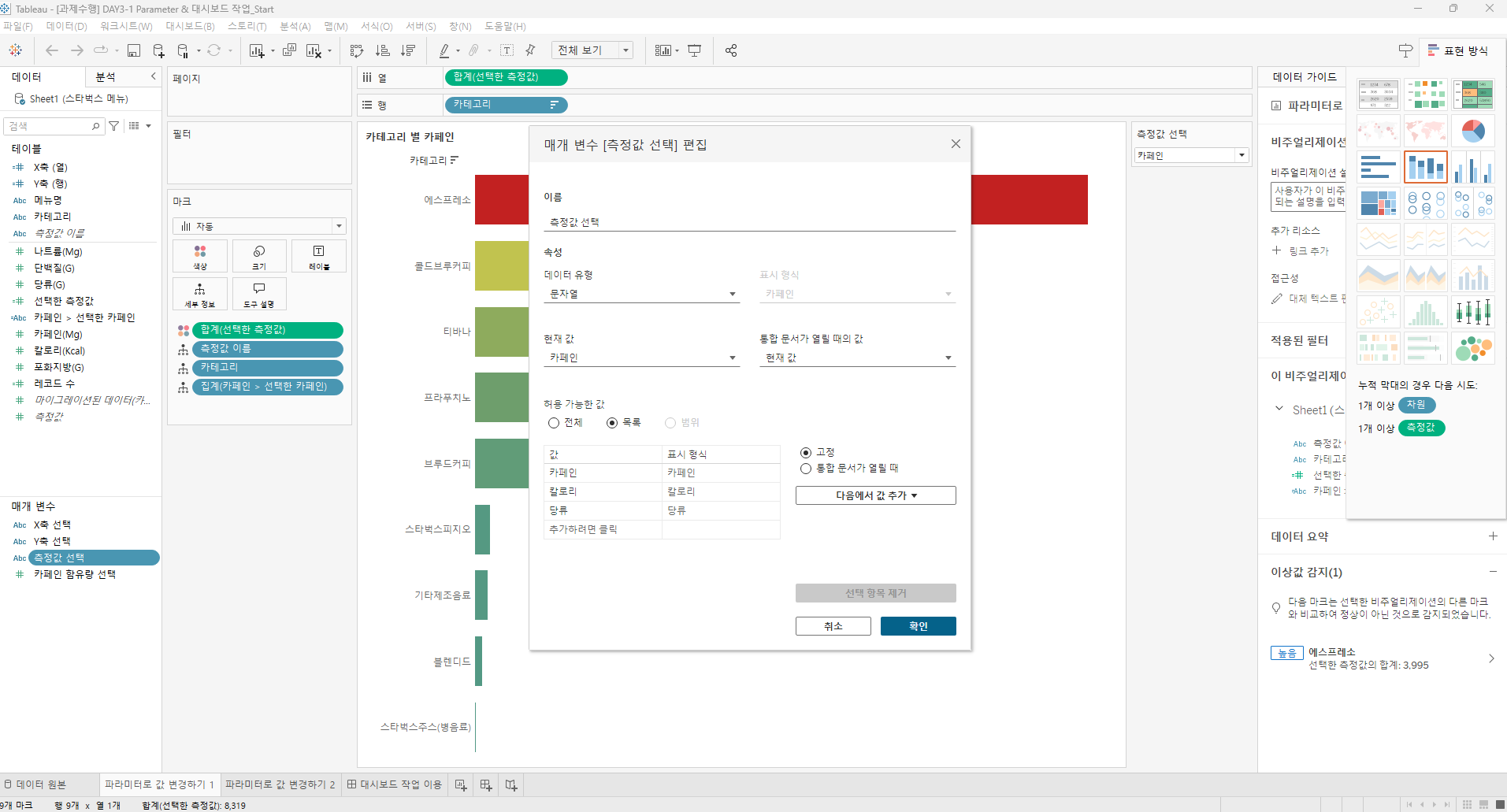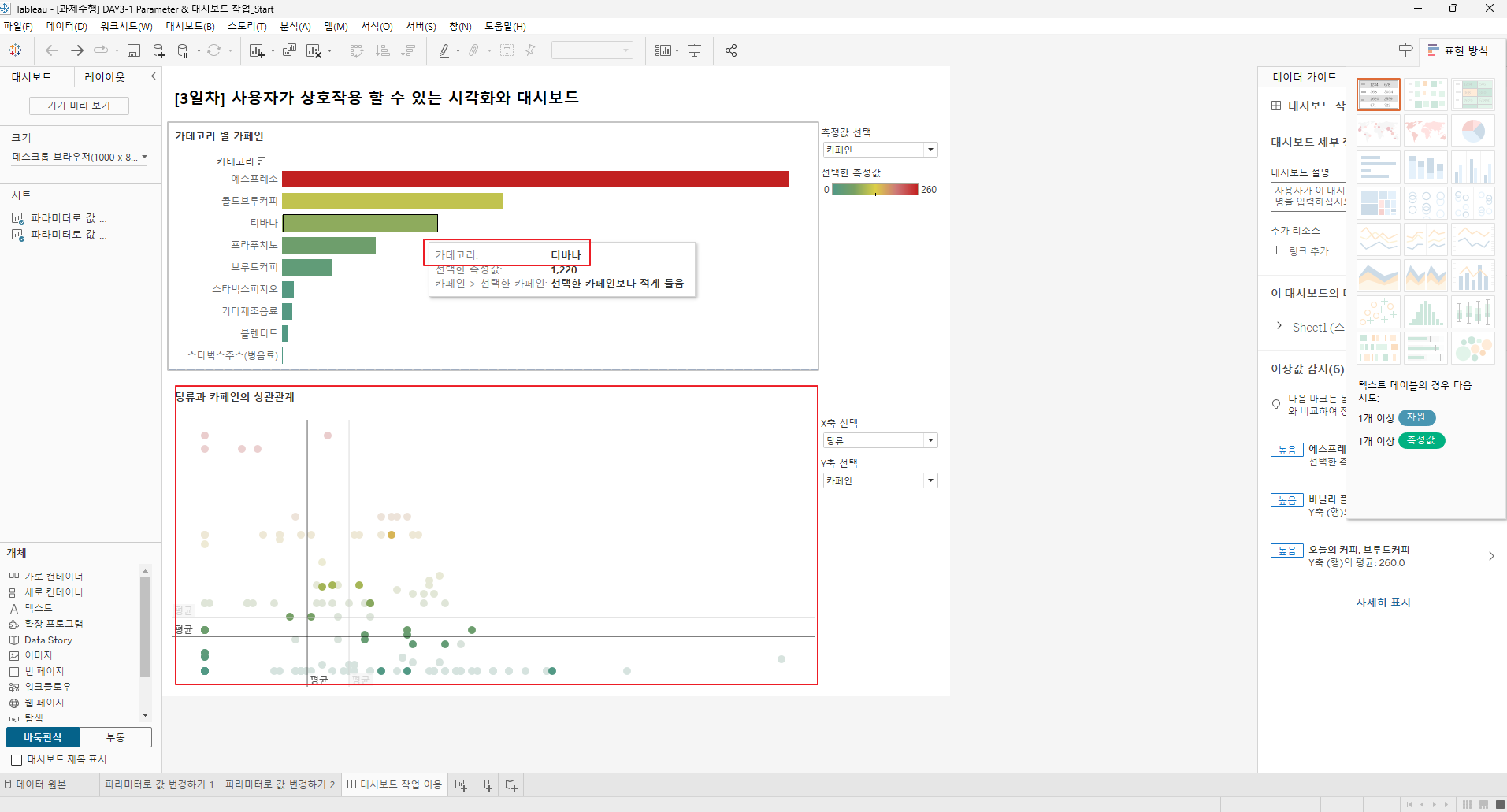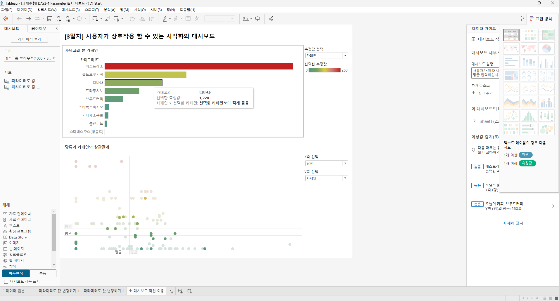 | Tableau 신병훈련소 25기 - 2Day: [2일차] 스타벅스 메뉴 데이터와 매장 정보 데이터를 이용한 좀 더 다양한 시각화와 분석 (0) | 2024.10.24 |