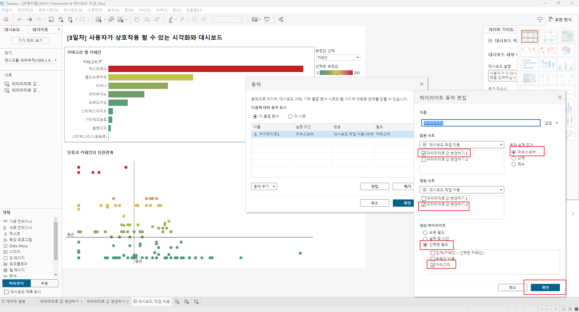 대시보드 - 동작 - 메뉴에서 1에서 마우스 오버시 두번째 시트에 '카테고리'에 따라 대상이 바뀌도록 동작을 지정해준다.