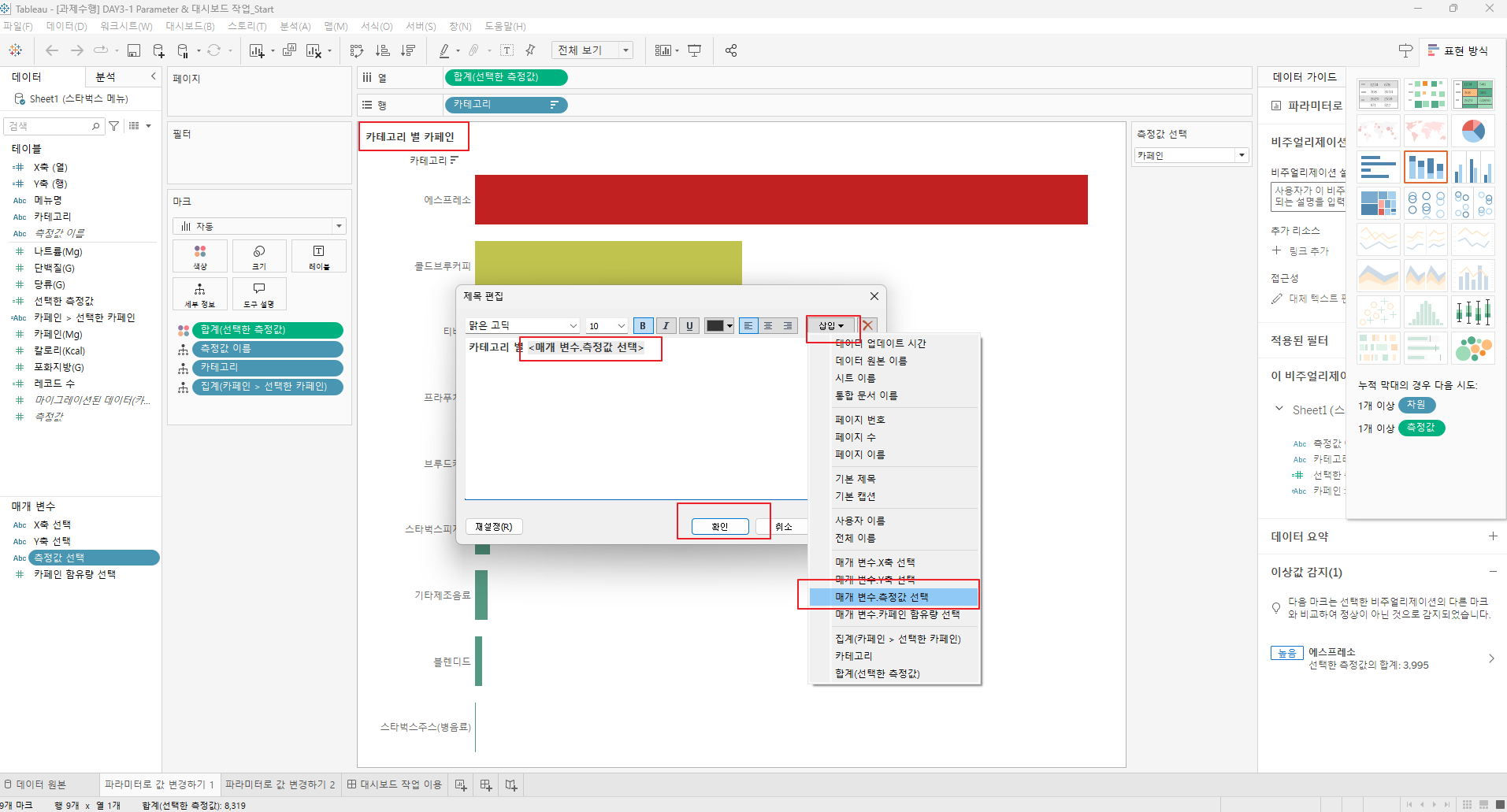 타이틀에 측정값 선택 매개변수를 삽입하면 선택시 바뀌는 단어를 확인 할 수 있다.