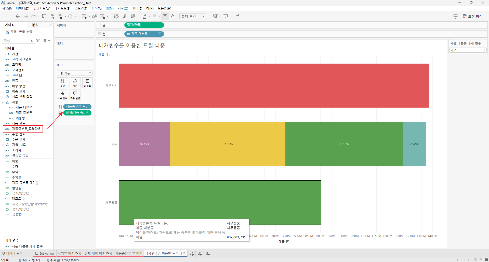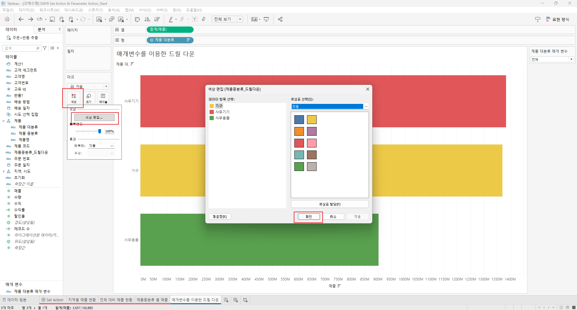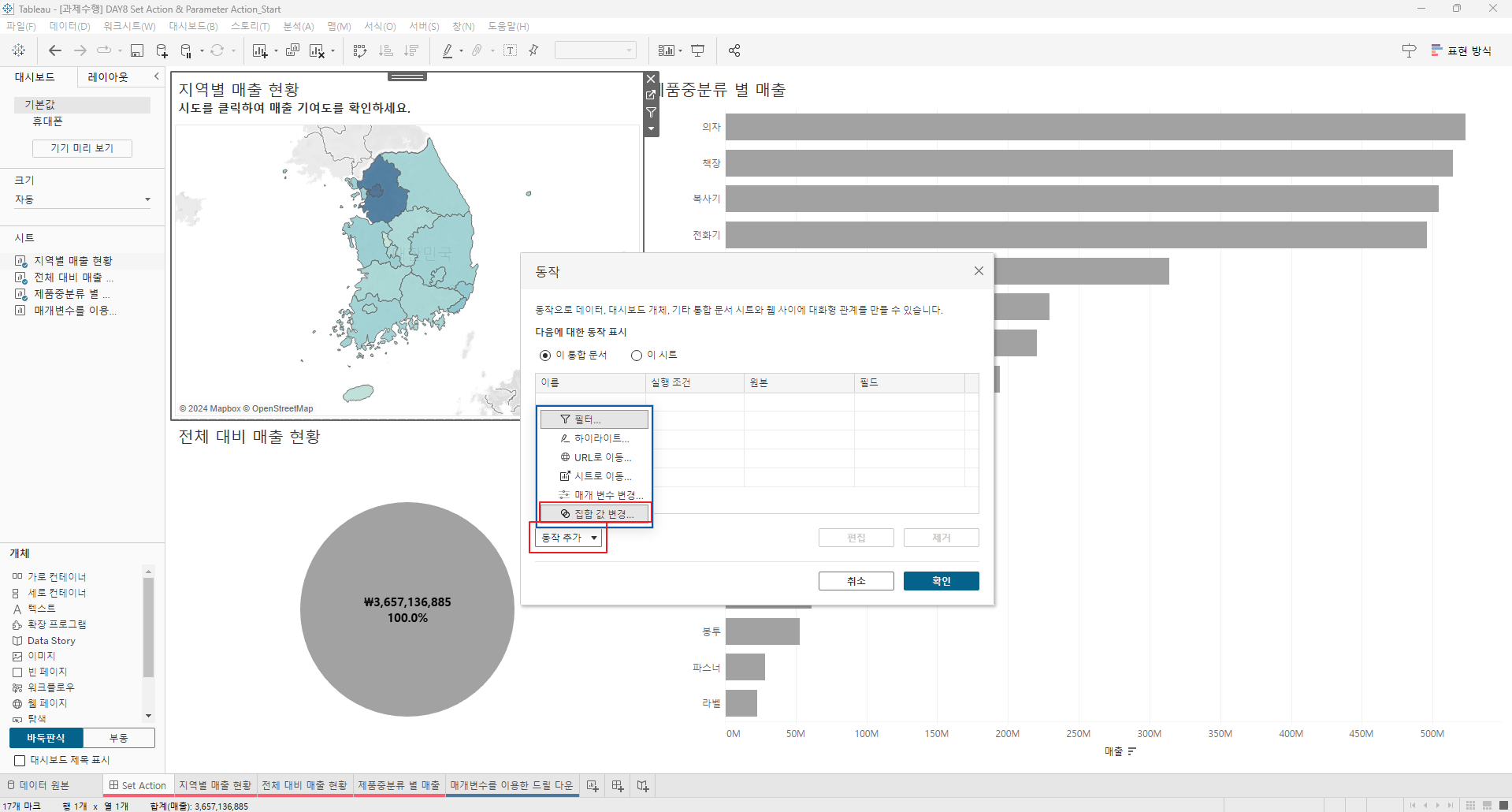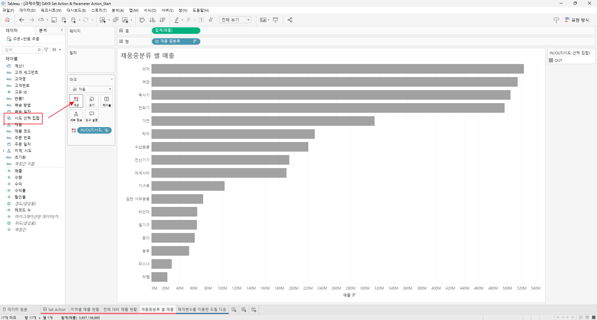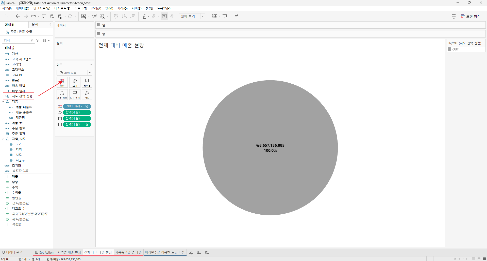 만들어진 집합을 전체 대비 매출현황과 제품 중분류 별 매출의 색상에 드래그한다.