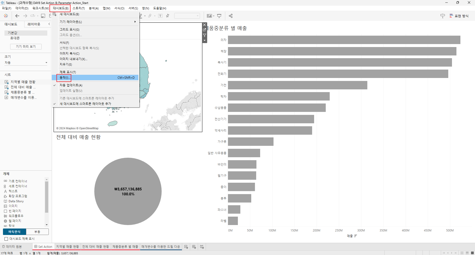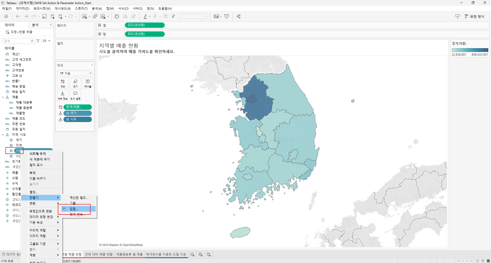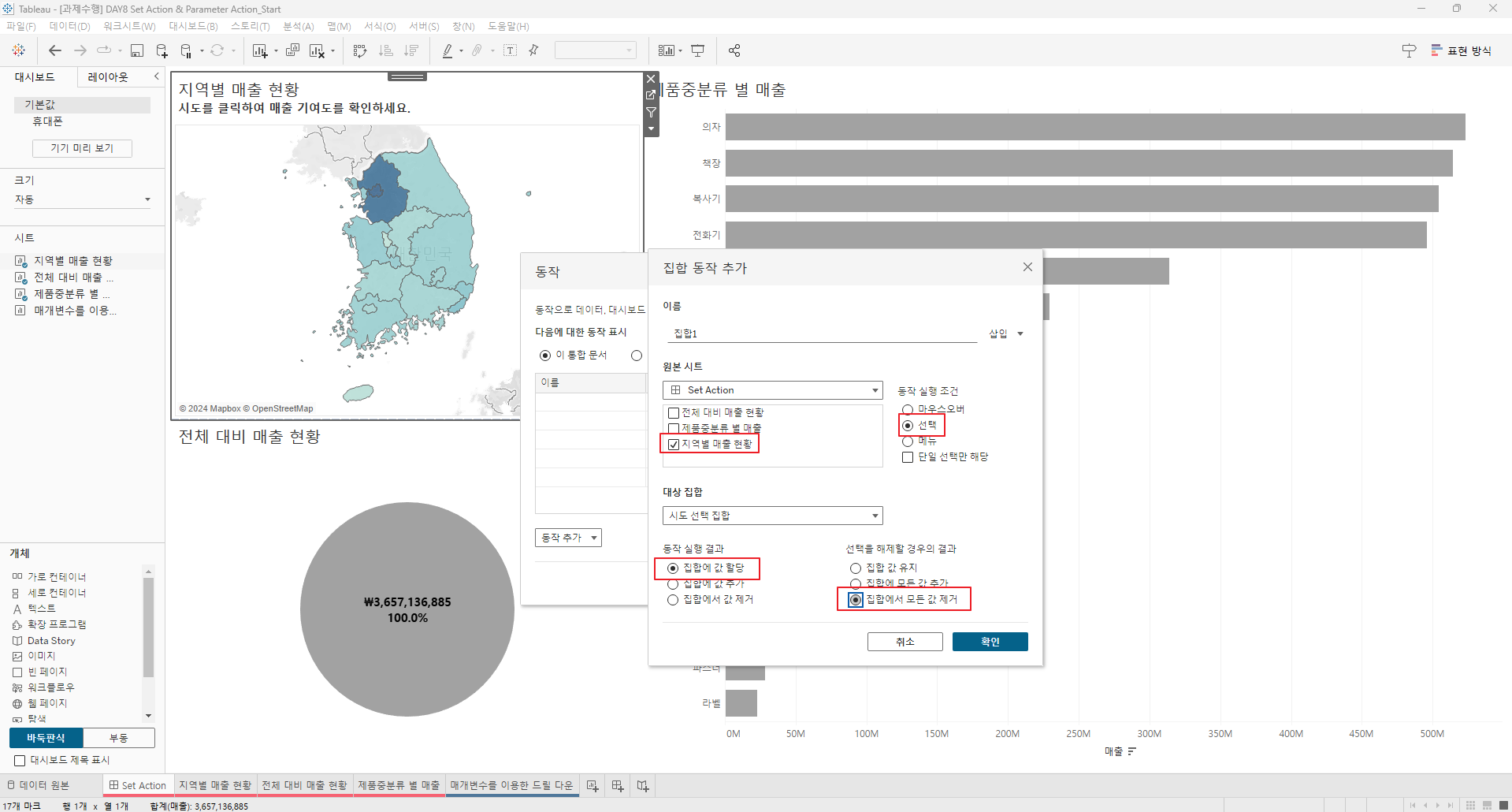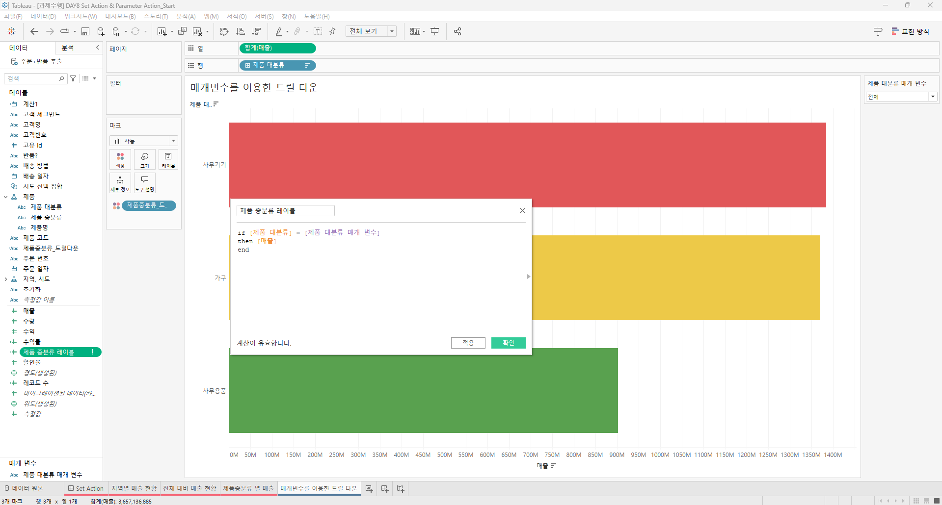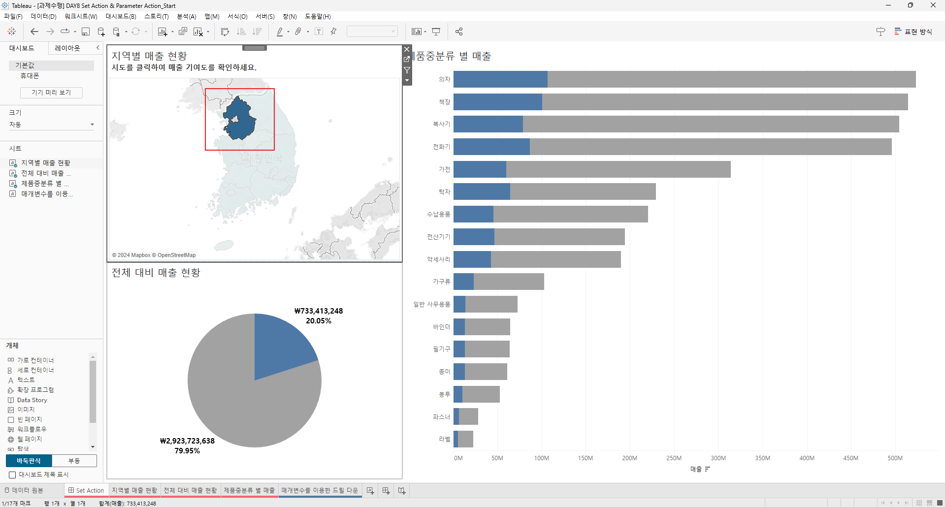 만들어진 집합을 전체 대비 매출현황과 제품 중분류 별 매출의 색상에 드래그한다.