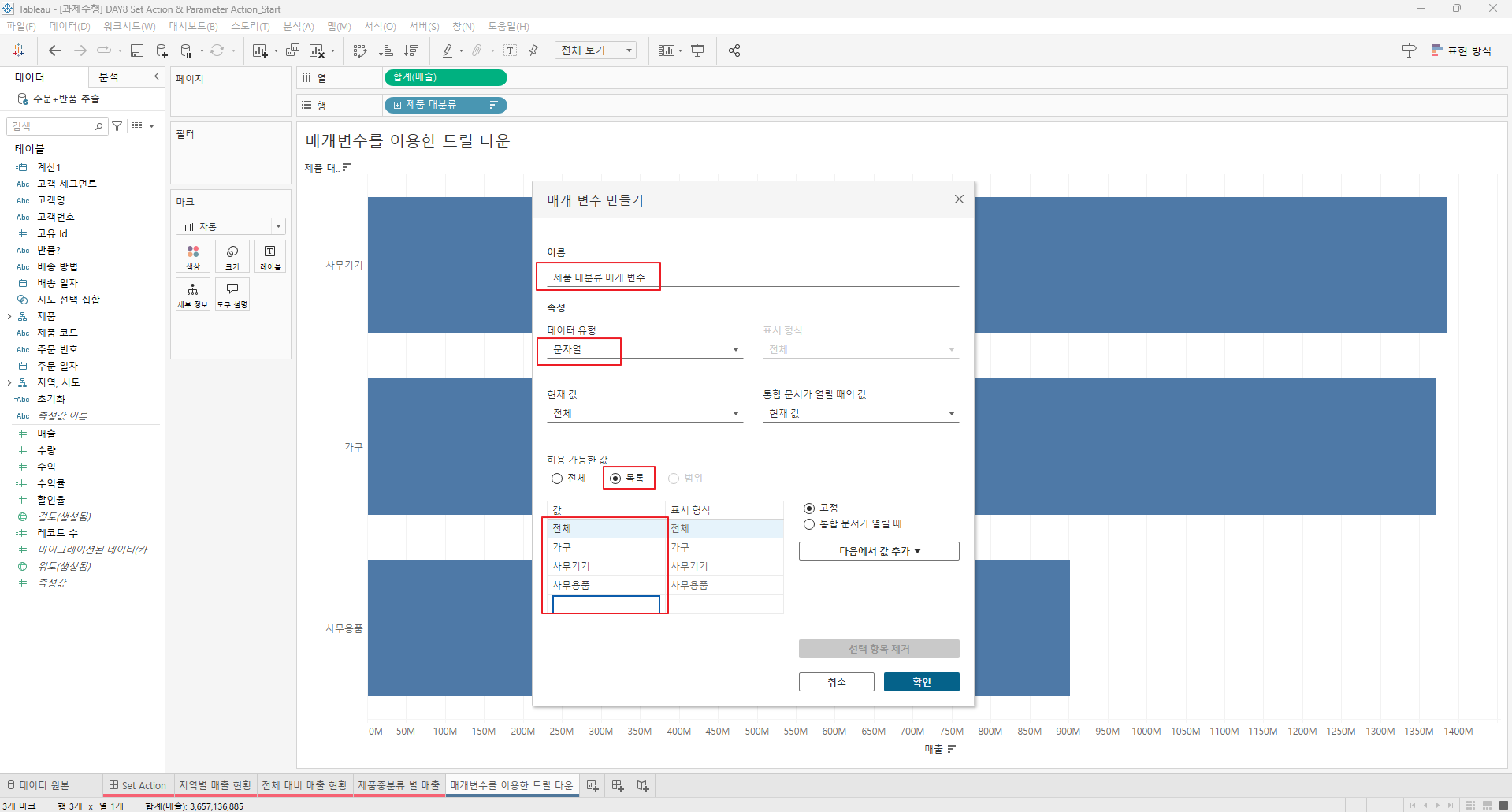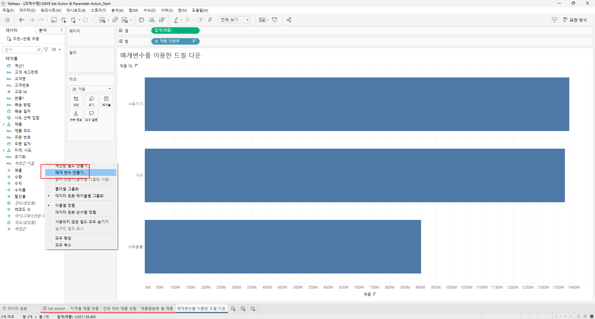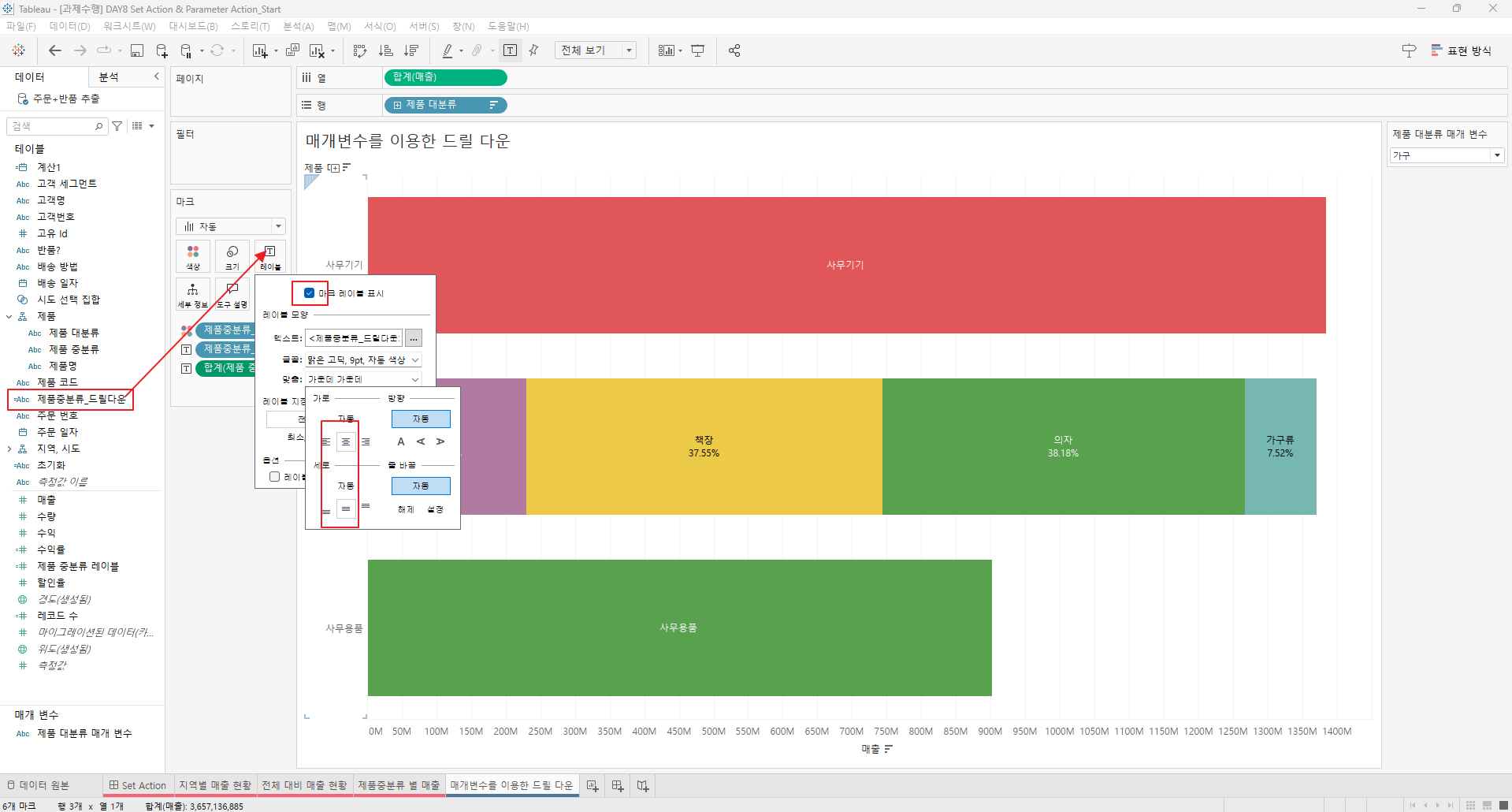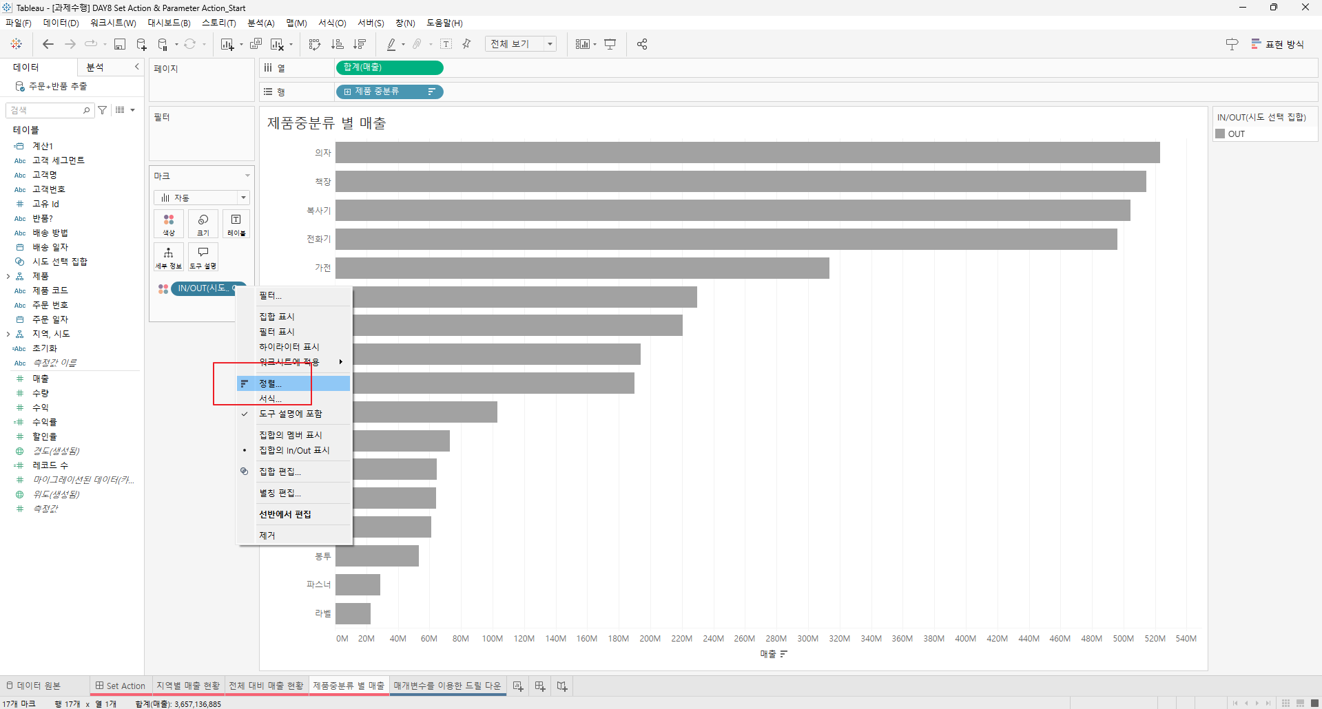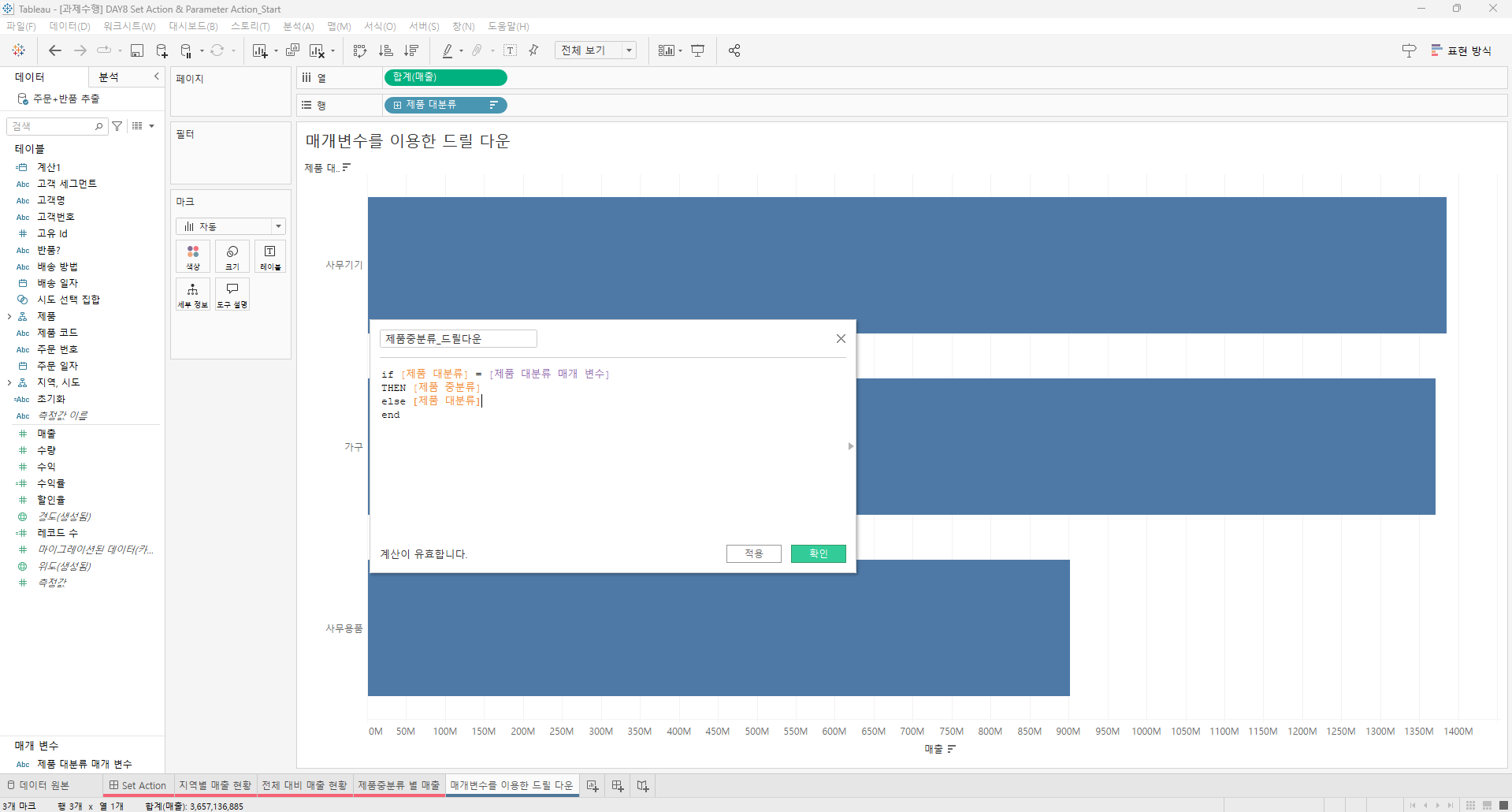 만들어진 집합을 전체 대비 매출현황과 제품 중분류 별 매출의 색상에 드래그한다.