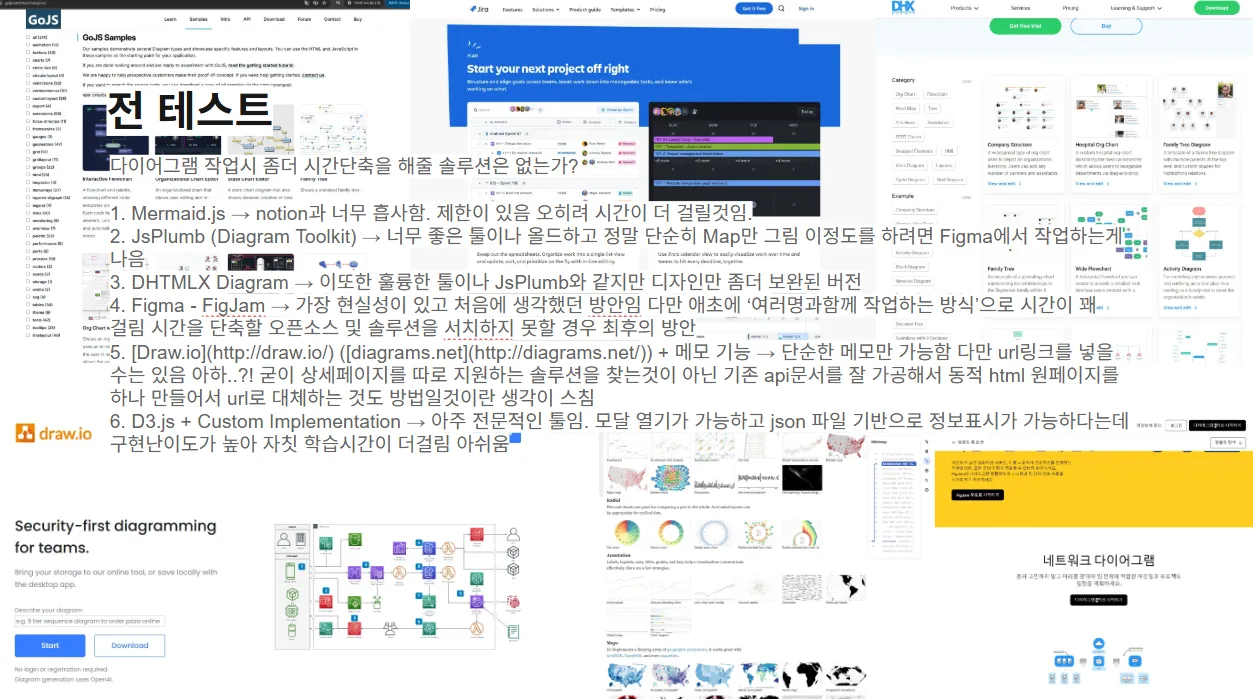 - Figma - FigJam → 가장 현실성이 있고 처음에 생각했던 방안임 다만 애초에 ‘여러명과함께 작업하는 방식’으로 시간이 꽤 걸림 시간을 단축할 오픈소스 및 솔루션을 서치하지 못할 경우 최후의 방안