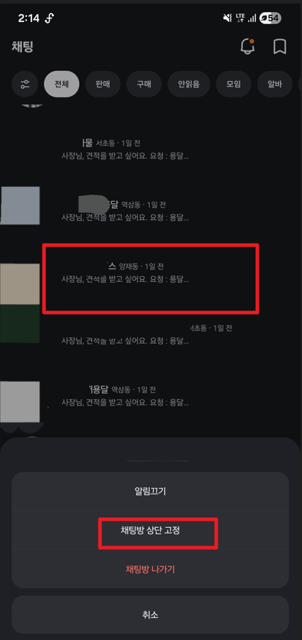 채팅방 리스트에서 꾹~ 길게 눌러 상단에 고정시켜주고