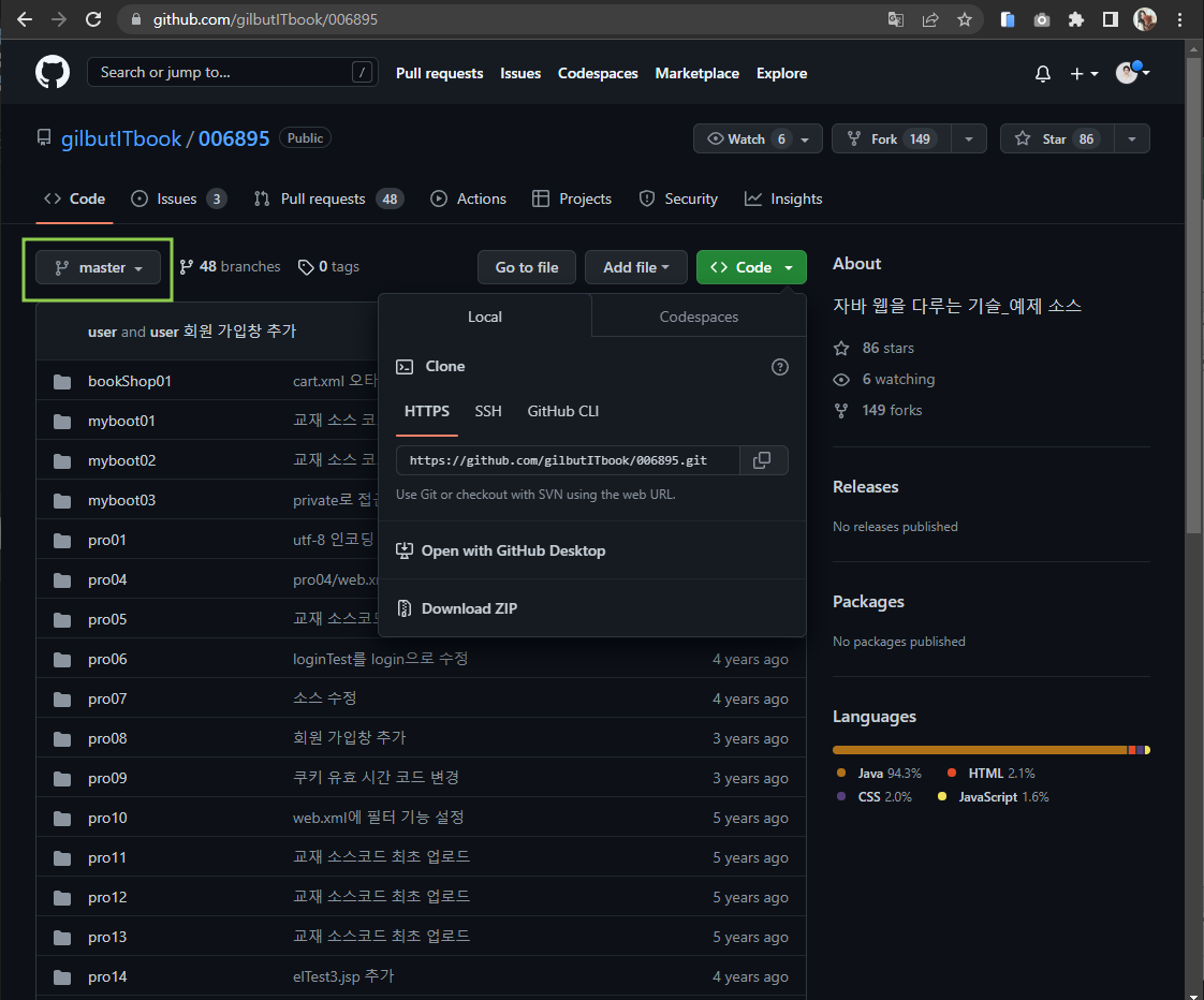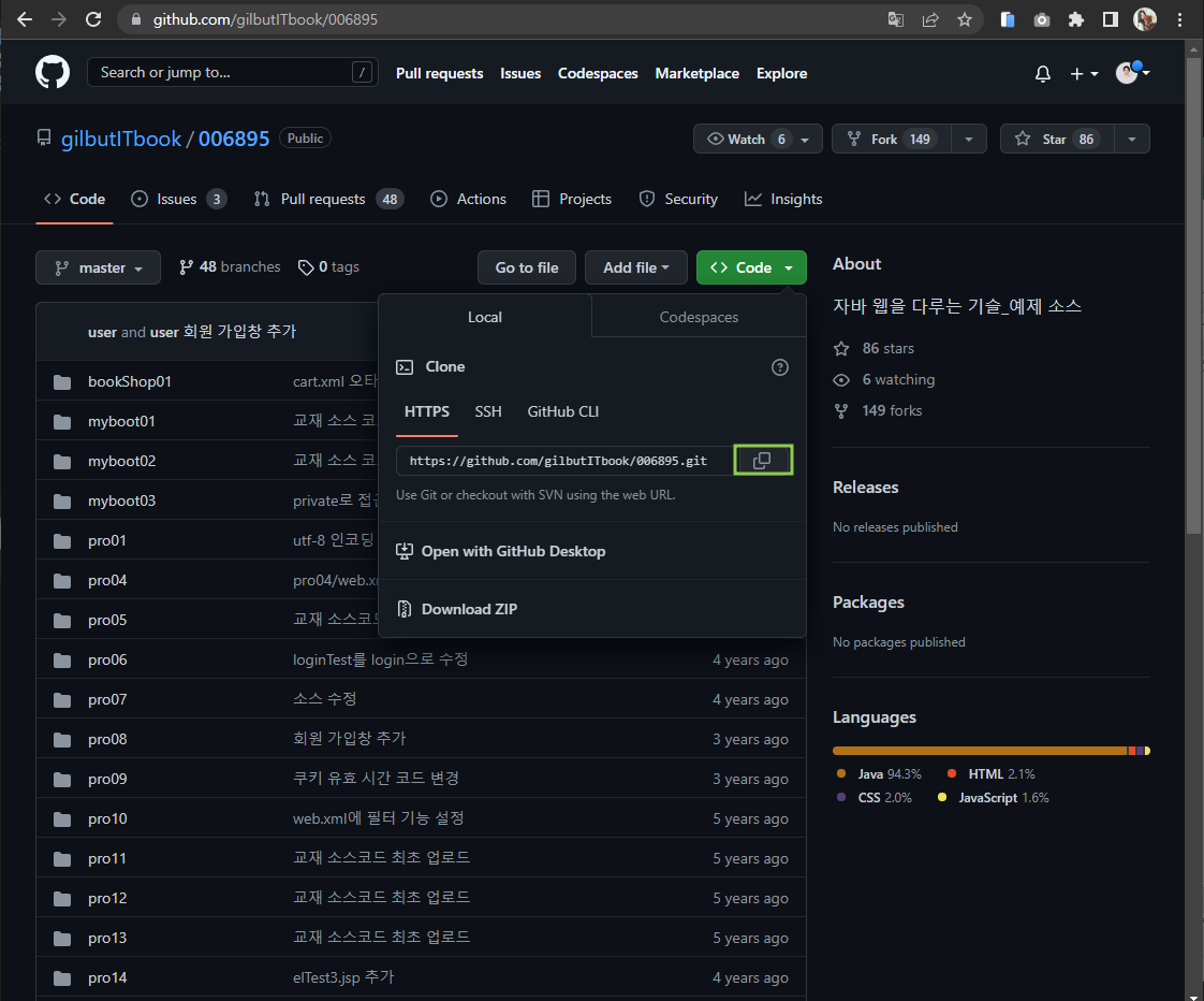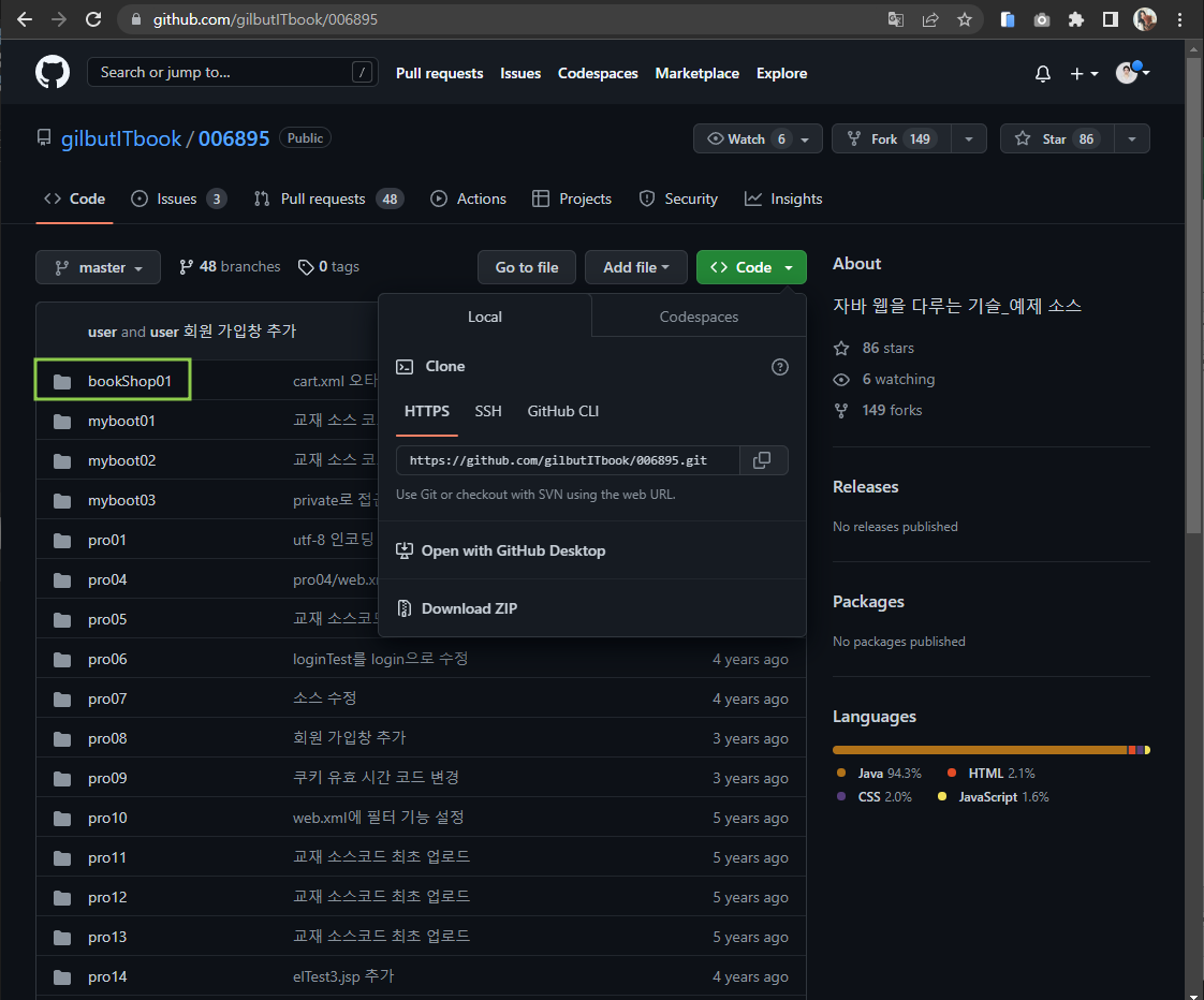 쇼핑몰 프로젝트를 위해 길벗 예제 소스를 clone하려는 중에,