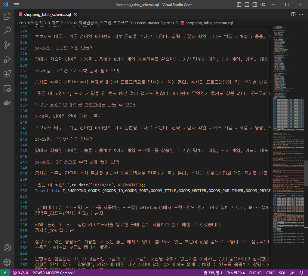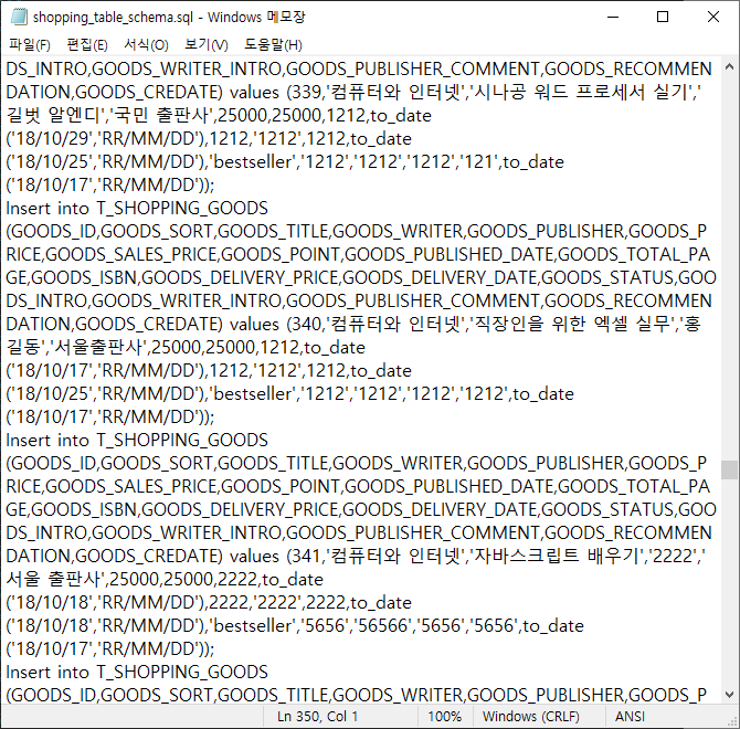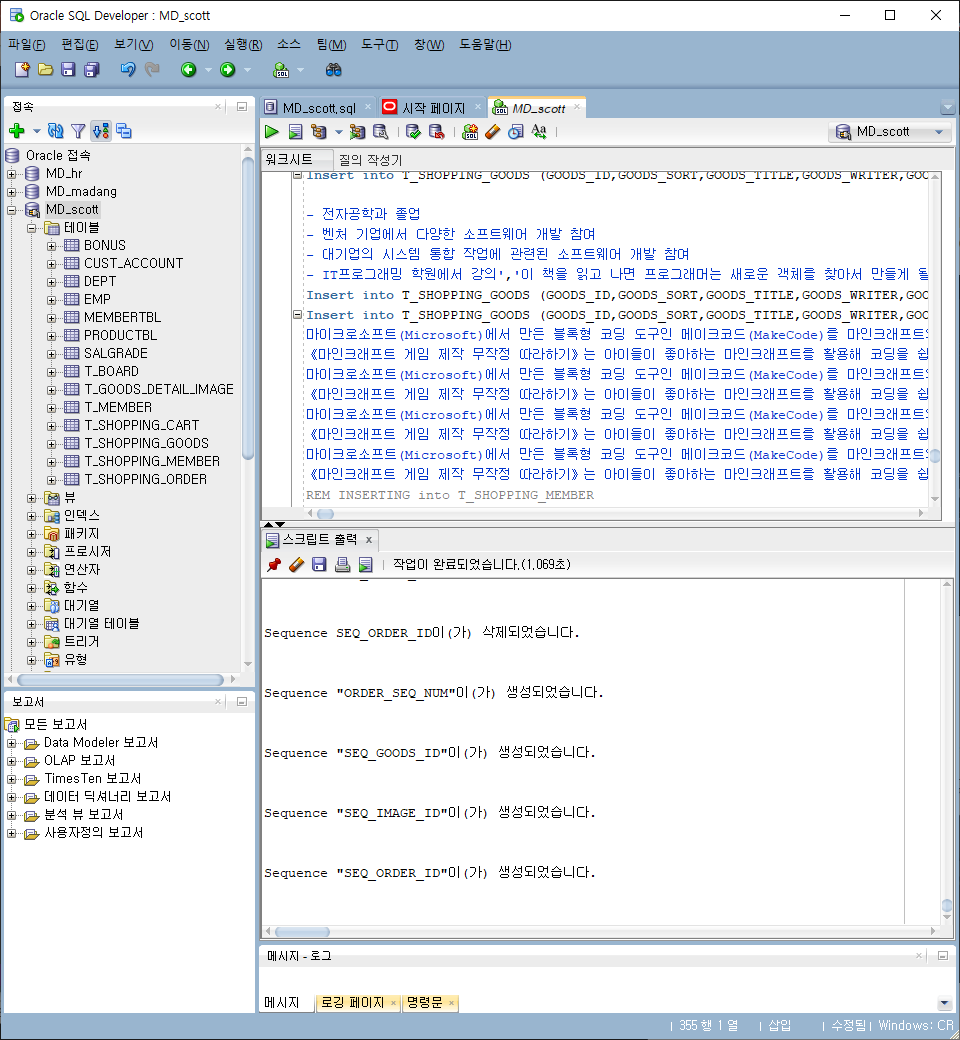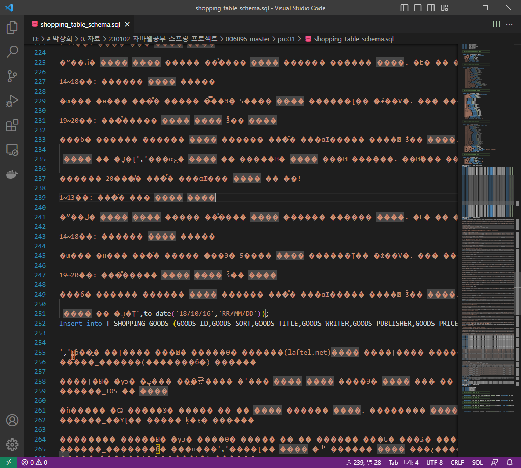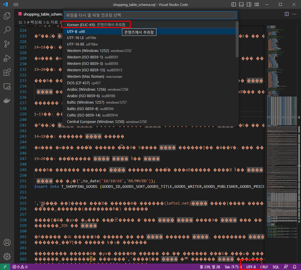 + 한글이 깨질경우, 복붙했던 sql문안의 한글이 깨져있을 확률이 높다.